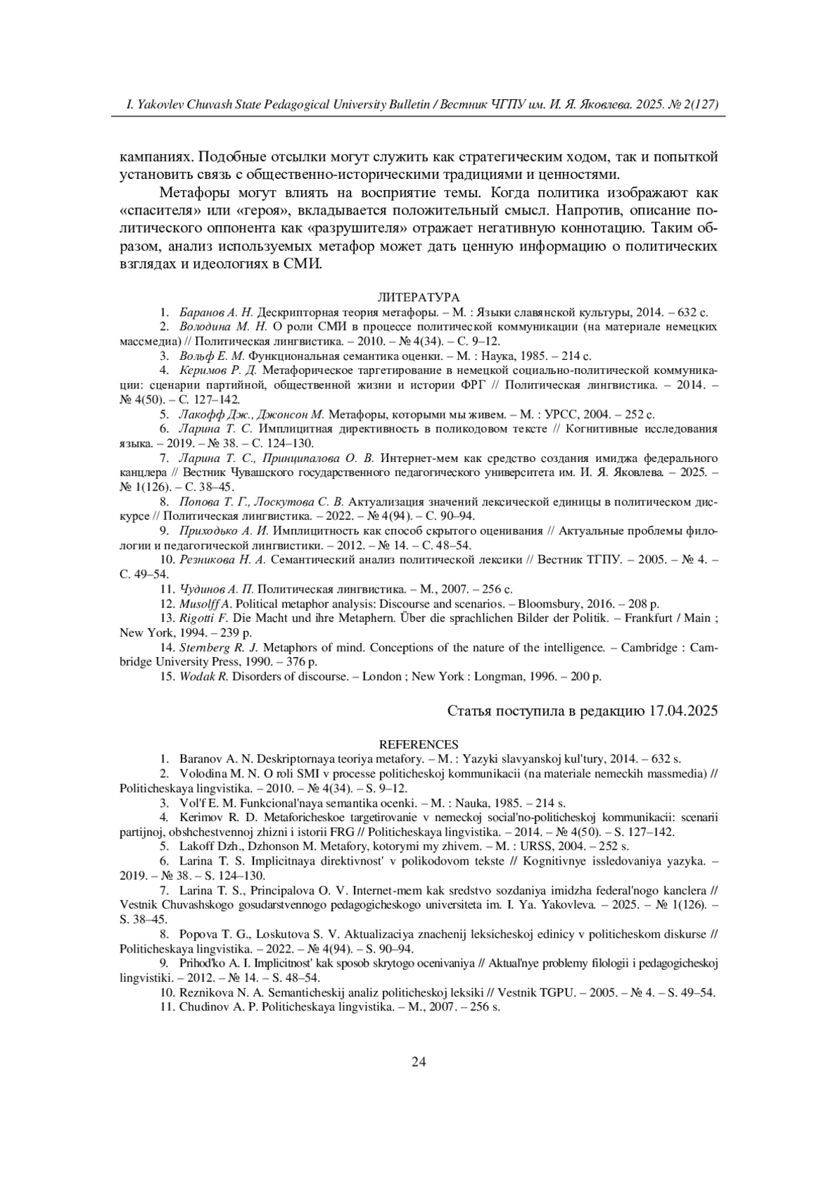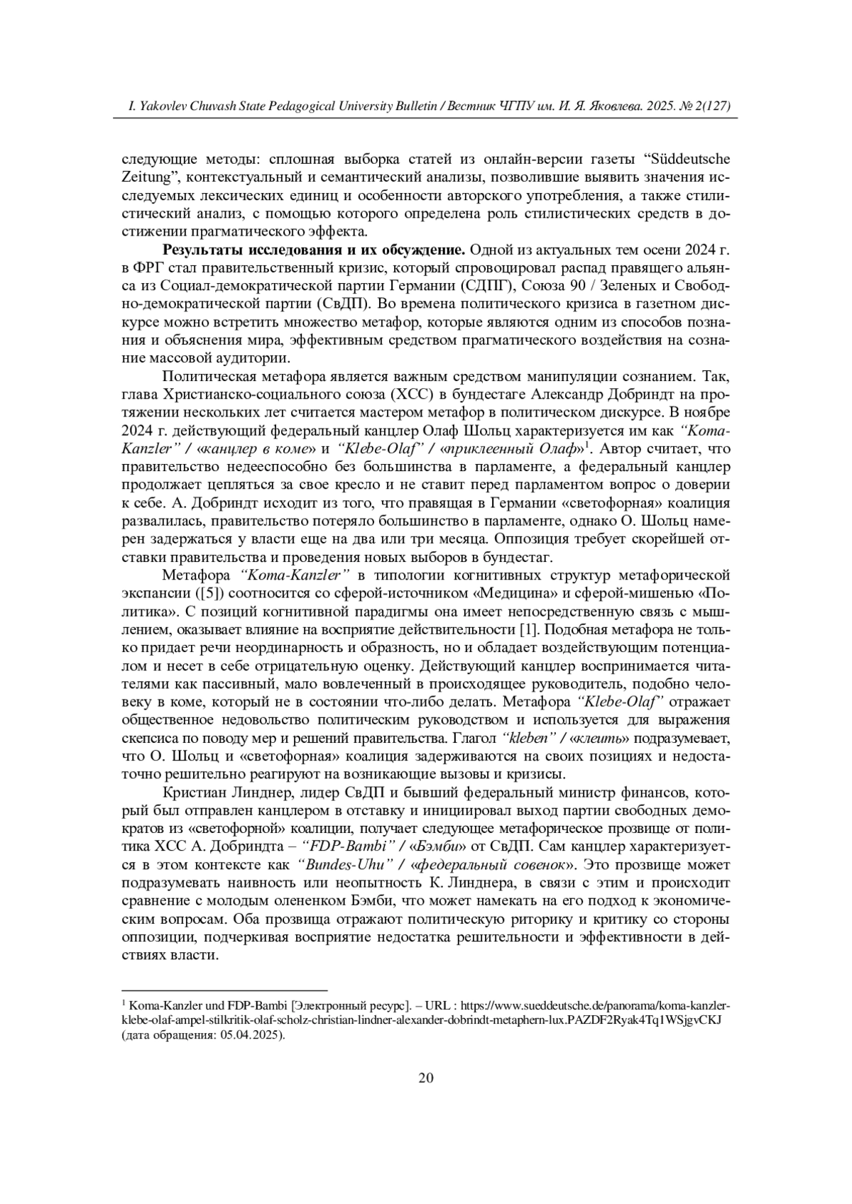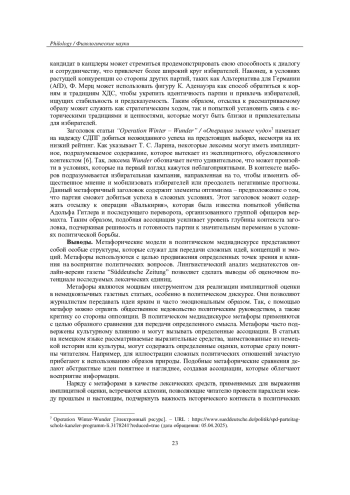 7. Ларина Т. С., Принципалова О. В.Интернет-мем как средство создания имиджа федерального канцлера // Вестник Чувашского государственного педагогического университета им. И. Я. Яковлева. - 2025. - № 1(126). - С. 38-45. EDN: QOVUWH