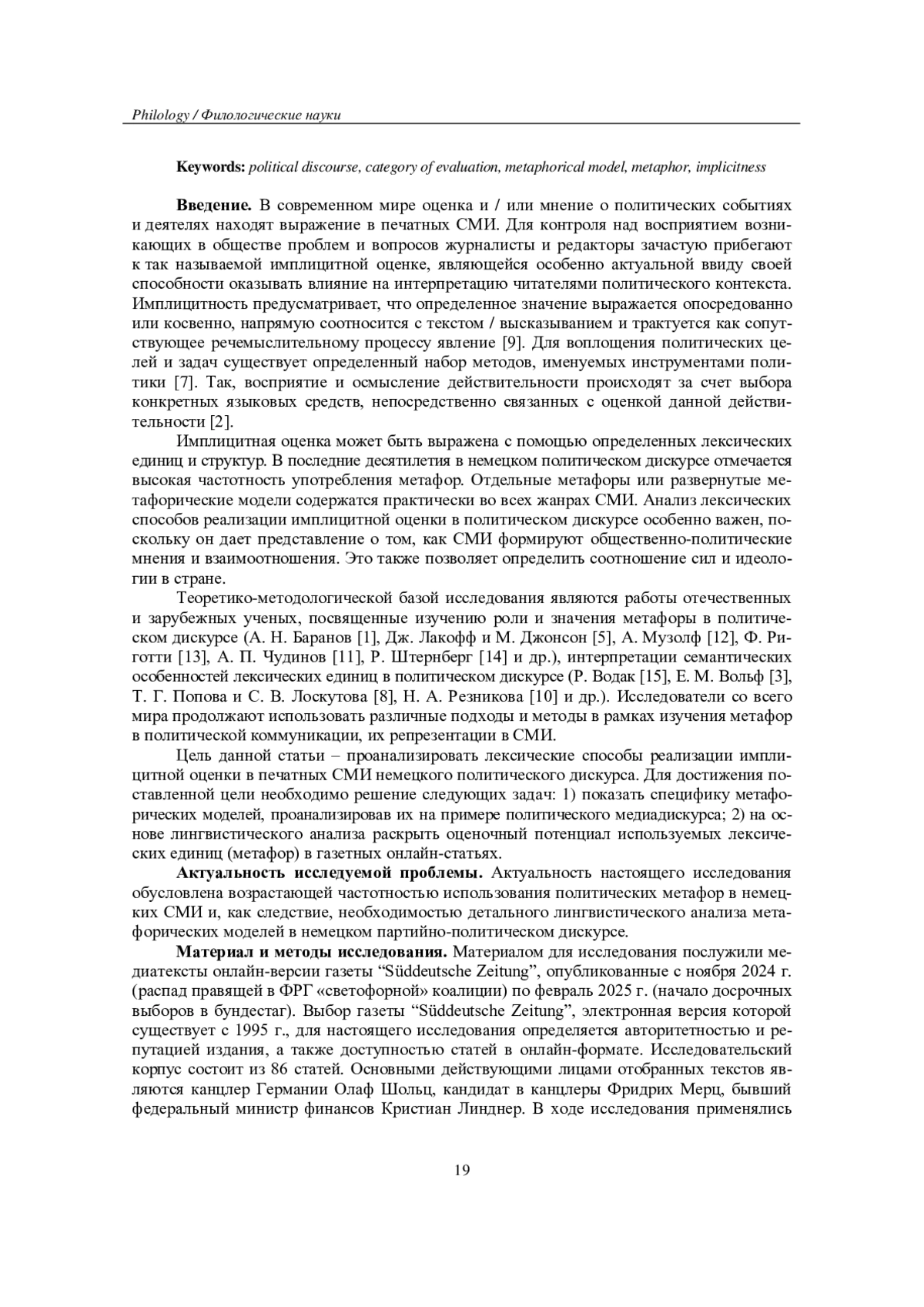 В статье на примере политического медиадискурса рассматриваются и анализируются метафорические модели и метафоры как лексические способы реализации имплицитной оценки в печатных СМИ с целью раскрытия их прагматического потенциала. В качестве материала исследования выступают медиатексты онлайн-версии газеты “Süddeutsche Zeitung”, опубликованные с ноября 2024 г. по февраль 2025 г., т. к. данный временной период характеризуется распадом правящей в ФРГ «светофорной» коалиции и началом досрочных выборов в бундестаг. Общий объем исследуемых единиц составляет 86 онлайн-статей, основными действующими лицами которых являются канцлер Германии Олаф Шольц, кандидат в канцлеры Фридрих Мерц, бывший федеральный министр финансов Кристиан Линднер. Актуальность настоящего исследования обусловлена возрастающей частотностью использования политических метафор в немецких СМИ и, как следствие, необходимостью детального лингвистического анализа метафорических моделей в немецком политическом медиадискурсе. Для анализа исследовательского корпуса применяются такие методы, как сплошная выборка, контекстуальный и семантический анализы, а также стилистический анализ, с помощью которого определена роль стилистических средств при достижении прагматического эффекта. В результате установлено, что метафоры являются мощным инструментом для реализации имплицитной оценки в немецкоязычных газетных статьях, особенно в политическом дискурсе. Они позволяют журналистам передавать идеи ярко и эмоционально, не прибегая к эксплицитным суждениям.