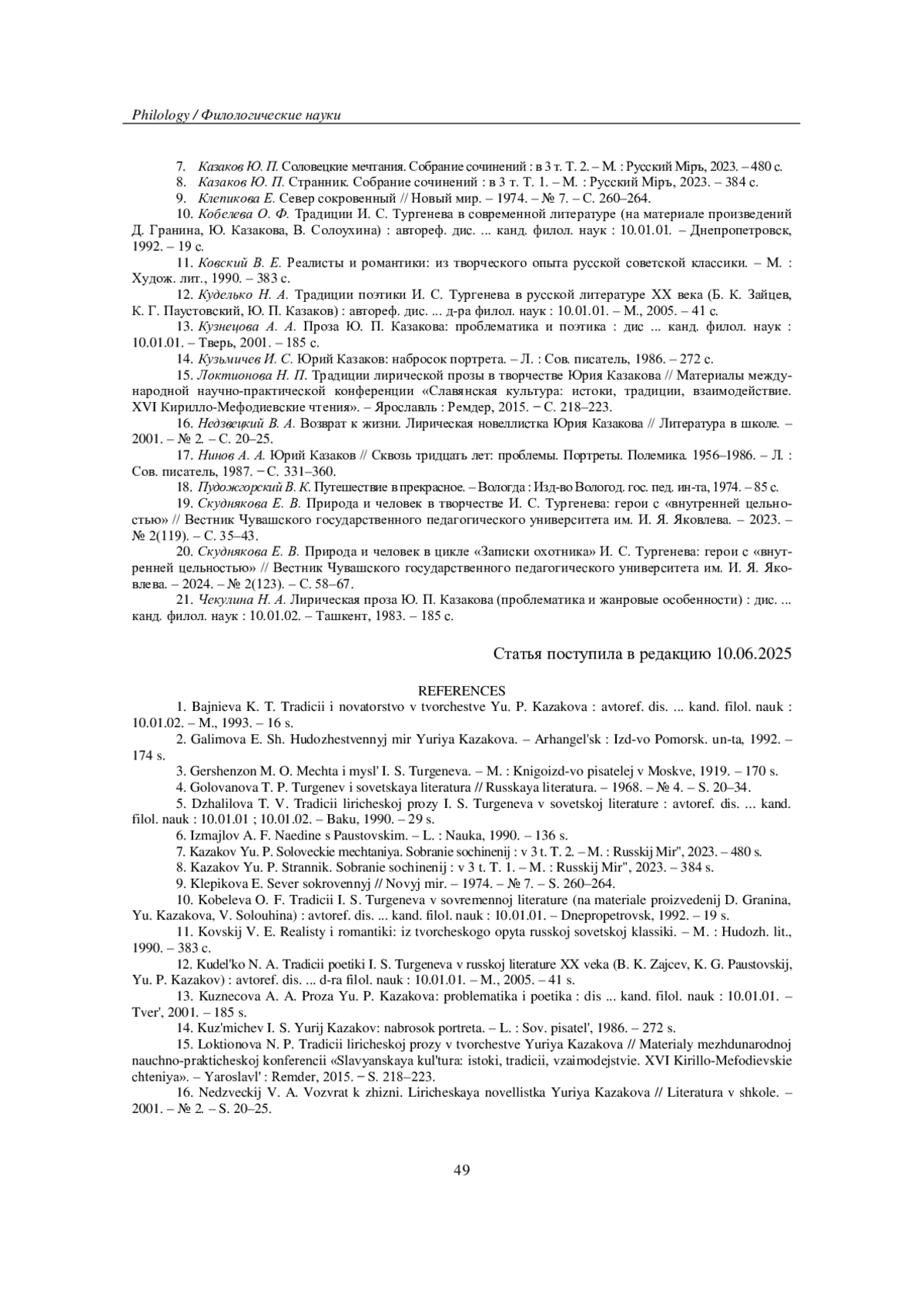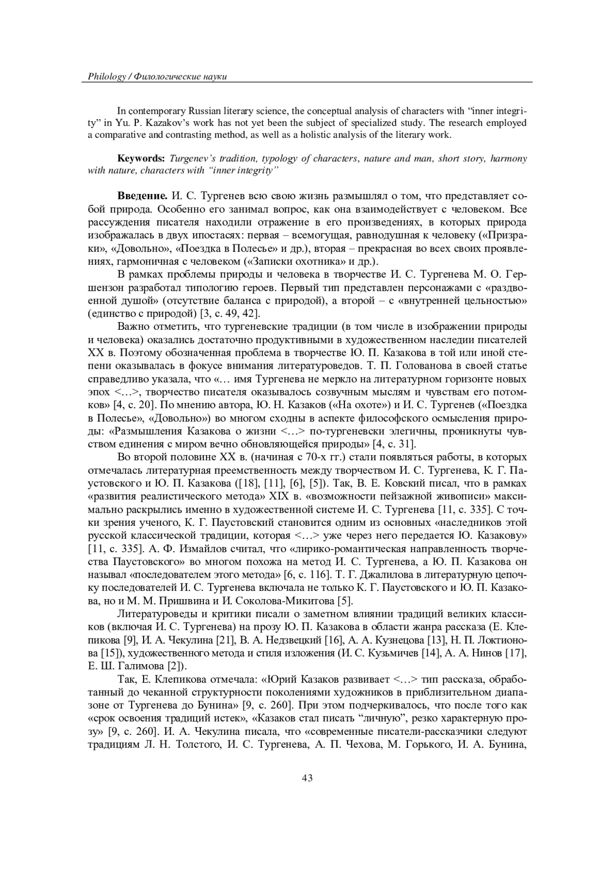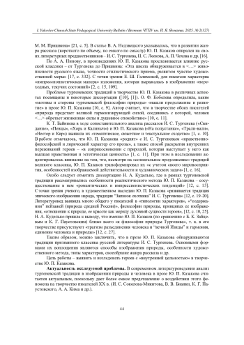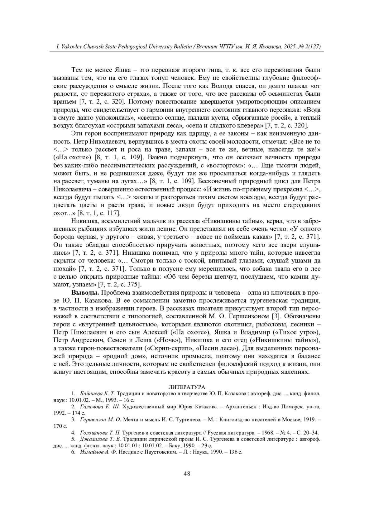 19. Скуднякова Е. В. Природа и человек в творчестве И. С. Тургенева: герои с “внутренней цельностью” // Вестник Чувашского государственного педагогического университета им. И. Я. Яковлева. - 2023. - № 2(119). - С. 35-43. EDN: WWOLHL