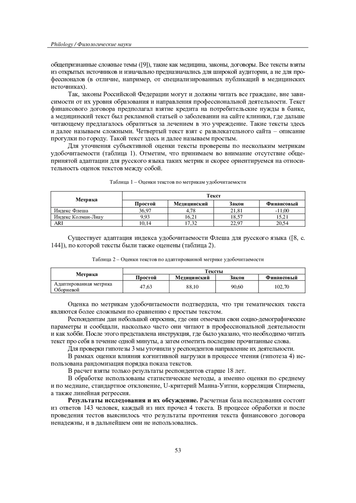 Статья посвящена изучению времени чтения текста как метрики удобочитаемости. В повседневности восприятие текста ограничено не только его сложностью, но и временем, которым располагает человек. Для расчета времени чтения необходимо знать скорость чтения про себя взрослого человека. Эта тема слабо представлена в существующих источниках и отличается высокой вариативностью. Время, затраченное на чтение, фактически стало частью Федерального закона «О рекламе», а расчеты по метрикам удобочитаемости - рутинной работой лингвиста. Мы подобрали четыре текста и попросили респондентов читать их в течение минуты, а затем указать, где они остановились. По итогам исследования рассчитана средняя скорость чтения про себя простого текста на основе результатов 143 человек - 275 слов в минуту (стандартное отклонение - 86). Выявлено, что сложные, специализированные тексты читаются медленнее в 0,74 раза (стандартное отклонение - 0,18) - примерно 203 слова в минуту (стандартное отклонение - 50). Скорость чтения зависит от многих факторов, и наибольшее влияние на нее оказывают уровень образования и чтение специализированной литературы. Кандидаты наук, доктора наук и люди, обладающие степенью PhD, читают быстрее всех, а те, кто получил только среднее общее образование, читают медленнее всех. Установлено, что юристы читают быстрее остальных как специализированные, так и простые тексты, а люди с медицинским образованием значительно медленнее читают юридические тексты.
