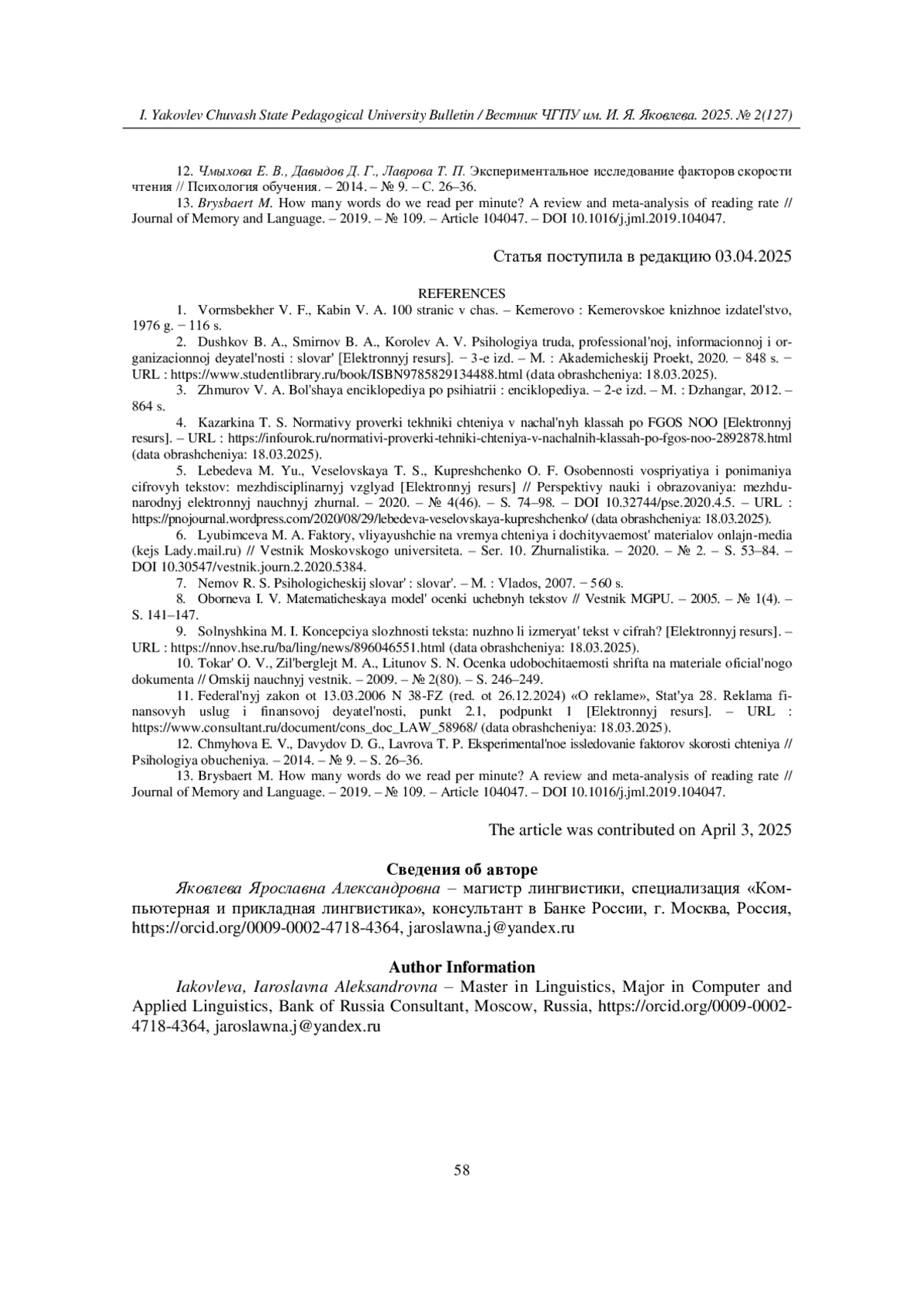 13. Brysbaert M. How many words do we read per minute? A review and meta-analysis of reading rate // Journal of Memory and Language. - 2019. - № 109. - Article 104047. DOI: 10.1016/j.jml.2019.104047 EDN: RWTRYU