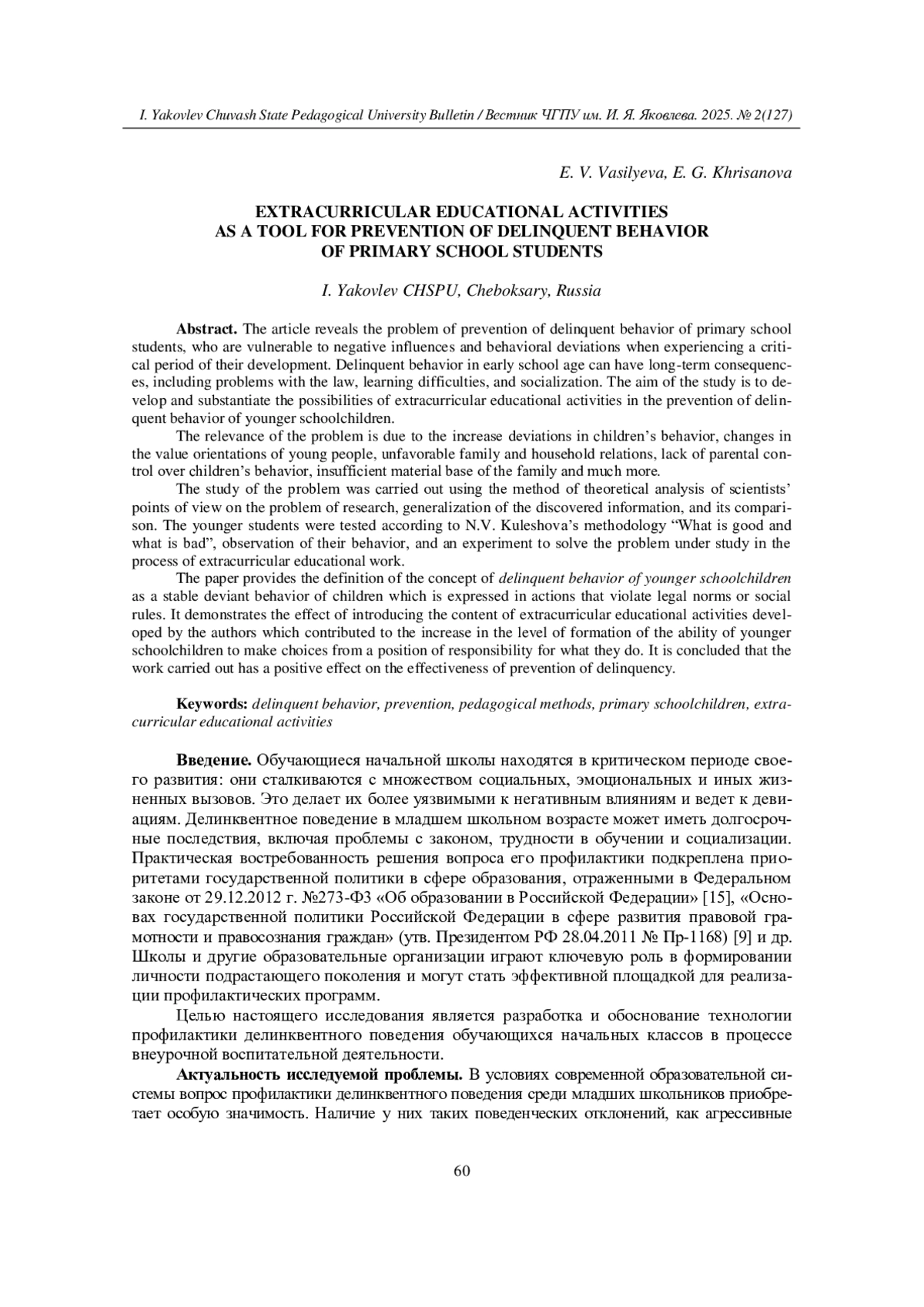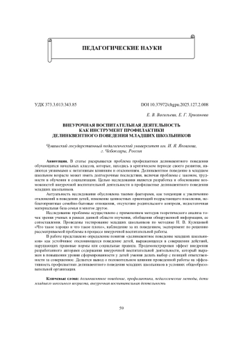 В статье раскрывается проблема профилактики делинквентного поведения обучающихся начальных классов, которые, находясь в критическом периоде своего развития, являются уязвимыми к негативным влияниям и отклонениям. Делинквентное поведение в младшем школьном возрасте может иметь долгосрочные последствия, включая проблемы с законом, трудности в обучении и социализации. Целью исследования является разработка и обоснование возможностей внеурочной воспитательной деятельности в профилактике делинквентного поведения младших школьников.