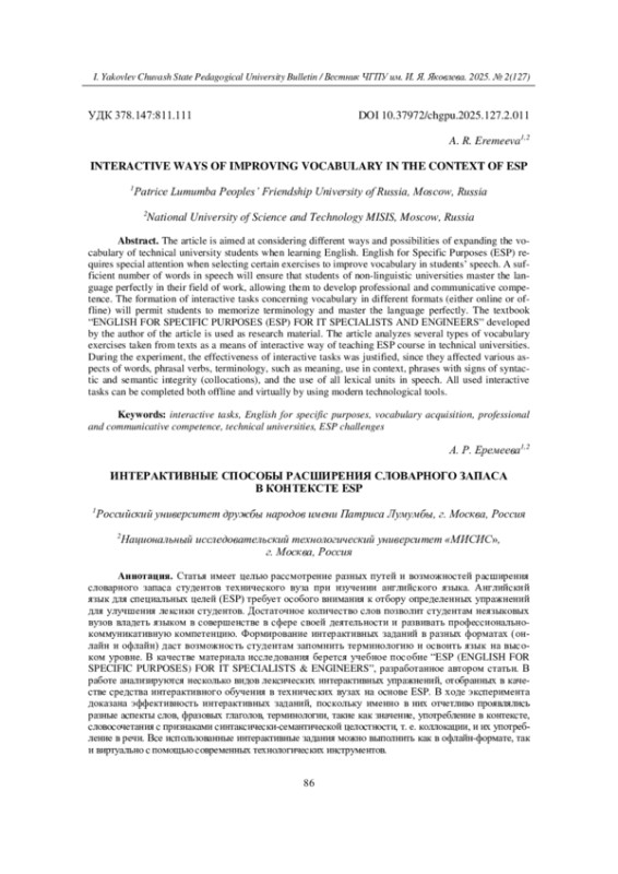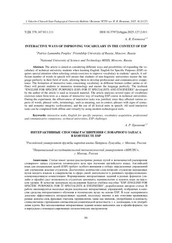 Статья имеет целью рассмотрение разных путей и возможностей расширения словарного запаса студентов технического вуза при изучении английского языка. Английский язык для специальных целей (ESP) требует особого внимания к отбору определенных упражнений для улучшения лексики студентов. Достаточное количество слов позволит студентам неязыковых вузов владеть языком в совершенстве в сфере своей деятельности и развивать профессионально-коммуникативную компетенцию. Формирование интерактивных заданий в разных форматах (онлайн и офлайн) даст возможность студентам запомнить терминологию и освоить язык на высоком уровне. В качестве материала исследования берется учебное пособие “ESP (ENGLISH FOR SPECIFIC PURPOSES) FOR IT SPECIALISTS & ENGINEERS”, разработанное автором статьи. В работе анализируются несколько видов лексических интерактивных упражнений, отобранных в качестве средства интерактивного обучения в технических вузах на основе ЕSP. В ходе эксперимента доказана эффективность интерактивных заданий, поскольку именно в них отчетливо проявлялись разные аспекты слов, фразовых глаголов, терминологии, такие как значение, употребление в контексте, словосочетания с признаками синтаксически-семантической целостности, т. е. коллокации, и их употребление в речи. Все использованные интерактивные задания можно выполнить как в офлайн-формате, так и виртуально с помощью современных технологических инструментов.