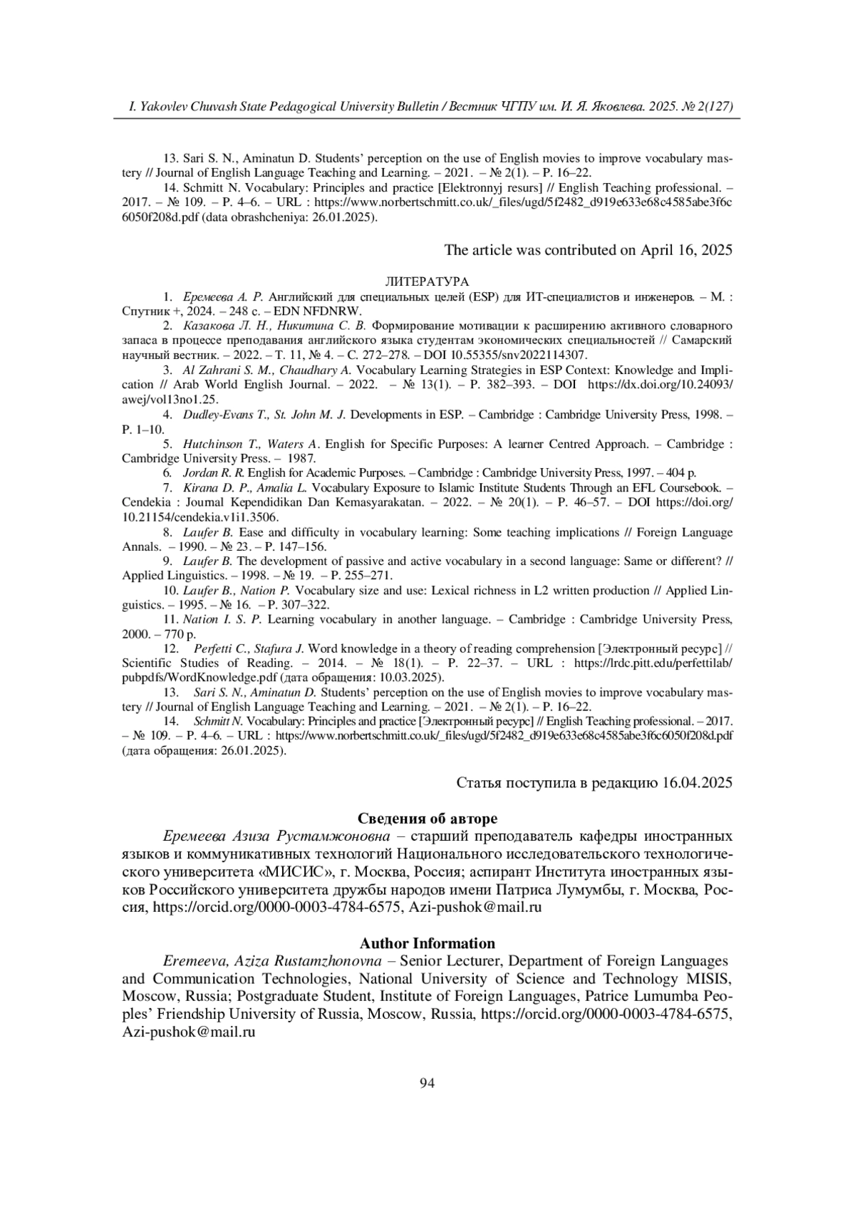 2. Kazakova L. N., Nikitina S. V. Formirovanie motivacii k rasshireniyu aktivnogo slovarnogo zapasa v processe prepodavaniya anglijskogo yazyka studentam ekonomicheskih special’nostej // Samarskij nauchnyj vestnik. - 2022. - T. 11, № 4. - C. 272-278. DOI: 10.55355/snv2022114307 EDN: LURZUE