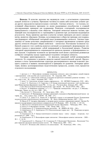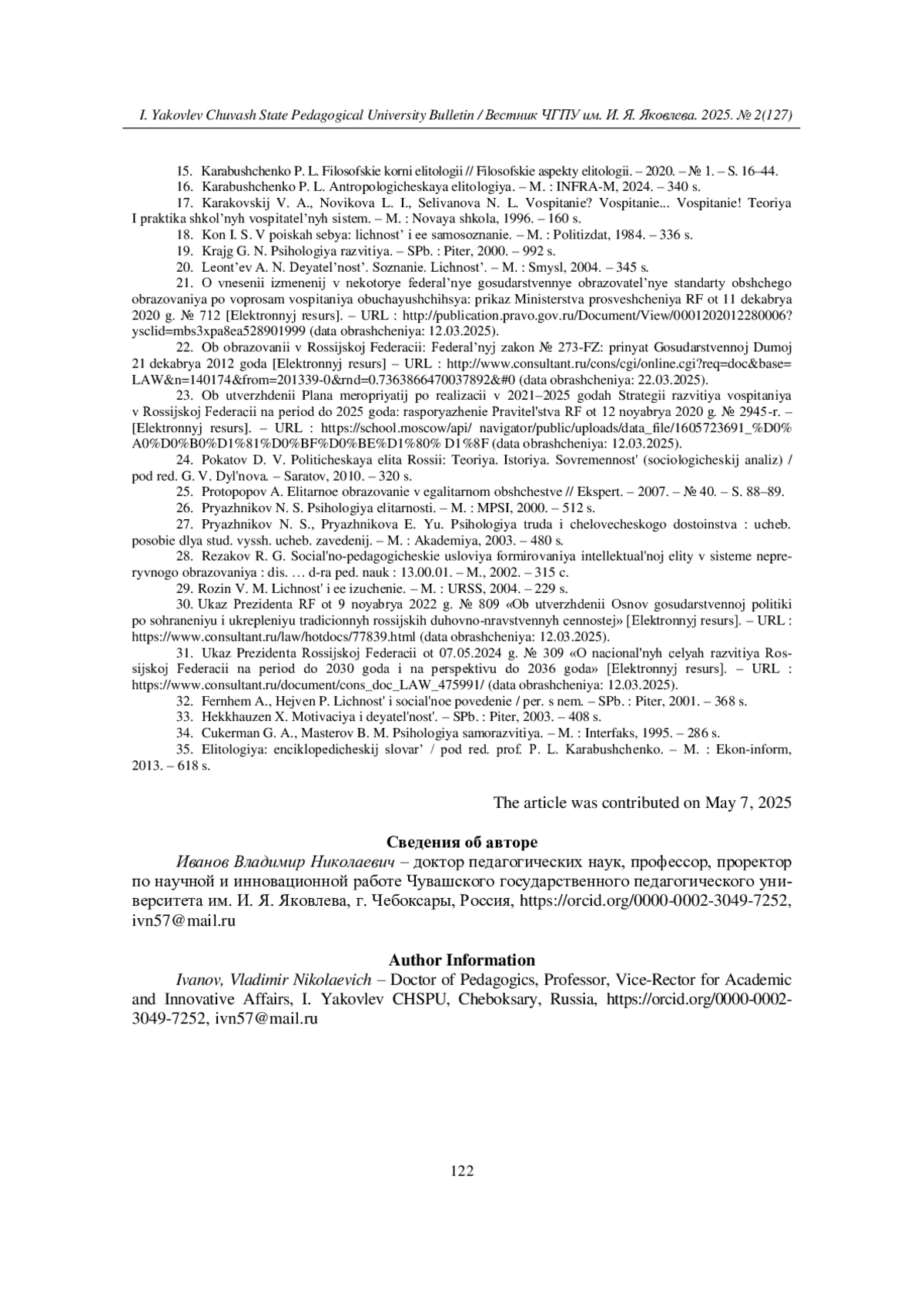 10. Иванов В. Н. Элитарное образование и элитарная школа: подходы к определению понятий // Вестник Чувашского государственного педагогического университета им. И. Я. Яковлева. - 2025. - № 1(126). - С. 107-116. EDN: ODKRVX