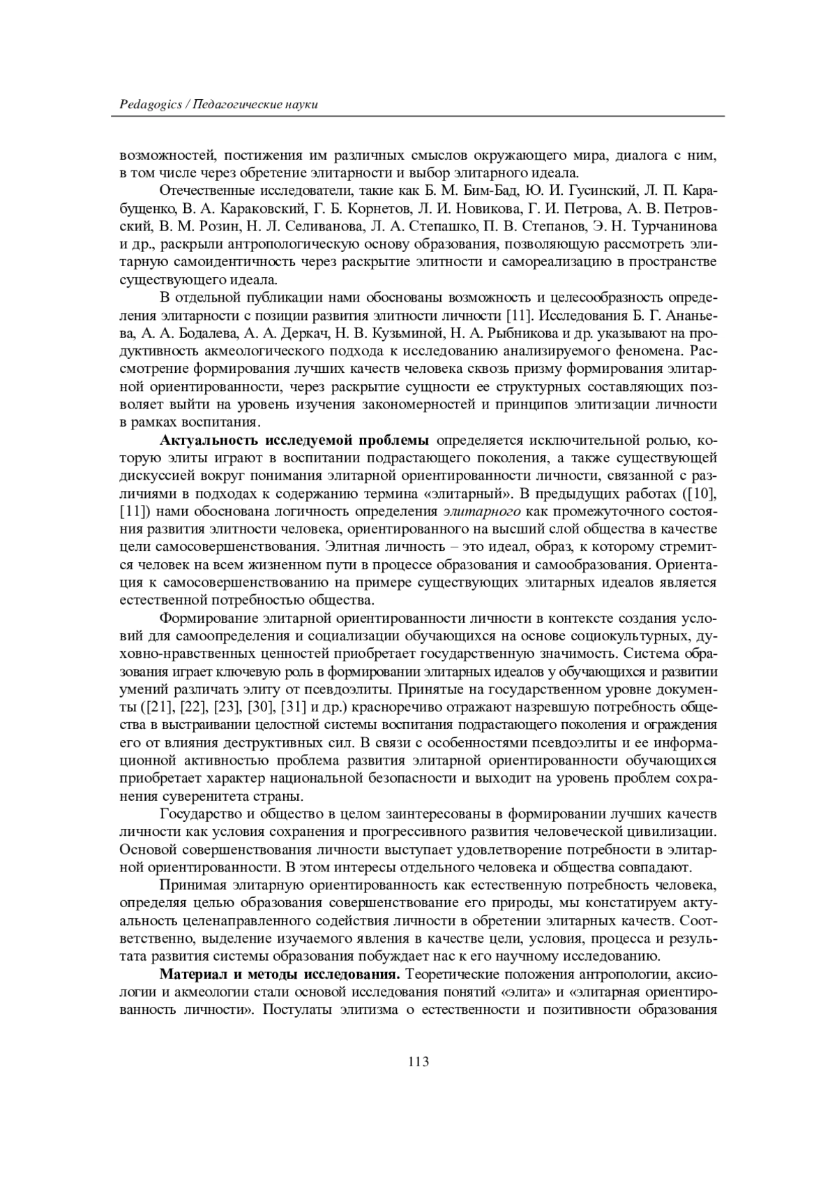 В центре внимания в статье - элитарная ориентированность как свойство личности. Рассмотрение элитности как критерия развития человека позволяет исследовать изучаемый феномен с позиций воспитательной ценности. Выдающиеся способности и принятие их массами делают личность элитной с точки зрения существующего идеального образа. Такой подход позволяет исследовать стремление человека к лучшему в проекции элитарной ориентированности как природной потребности личности. В статье представлен подход к определению данного явления с позиций акмеологической теории. В соответствии c устоявшимися в педагогике традициями структурная модель личности представлена ценностно-мотивационной, когнитивной и деятельностно-поведенческой составляющими.