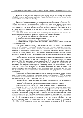Исследование развития системы архивного образования в России в 19201930-е гг. представляет значительный научный интерес как с точки зрения исторического анализа, так и в контексте современных проблем архивного дела ([3], [5]). Этот период стал переломным в формировании советской модели подготовки архивных кадров, когда на смену дореволюционным подходам пришла централизованная система образования ([11], [12], [13]).