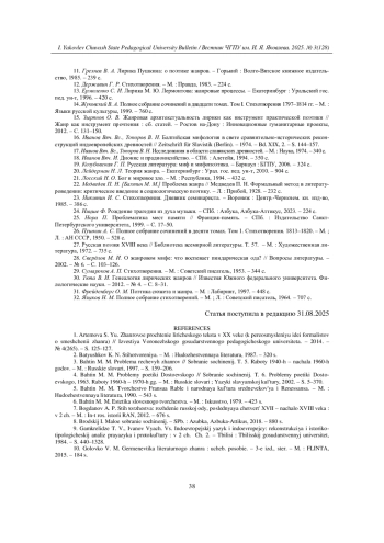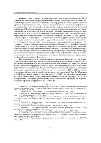 1. Артемова С. Ю. Жанровое прочтение лирического текста в XX веке (к переосмыслению идеи формалистов о смещении жанра) // Известия Воронежского государственного педагогического университета. - 2014. - № 4(265). - С. 125-127. EDN: THNTCJ