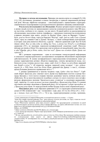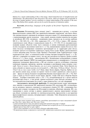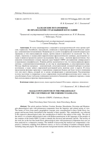 Потамонимы (греч. ποταμός ‘река’) – названия рек и ручьев – в составе фразеологических единиц (ФЕ) уже привлекали внимание языковедов: они были объектом лингвистического описания на материале польского языка [13], анализировались вместе с наименованиями других водоемов – озер, морей, океанов, водных каналов (на материале китайских ФЕ [12]), топонимов – названиями стран, городов и др. (в составе сербских ФЕ [3, с. 340–342], [4, с. 181–184], хорватских [19, s. 211–212]), а также с ФЕ лексикотематического поля «Вода» в македонском языке [8, с. 153–156].