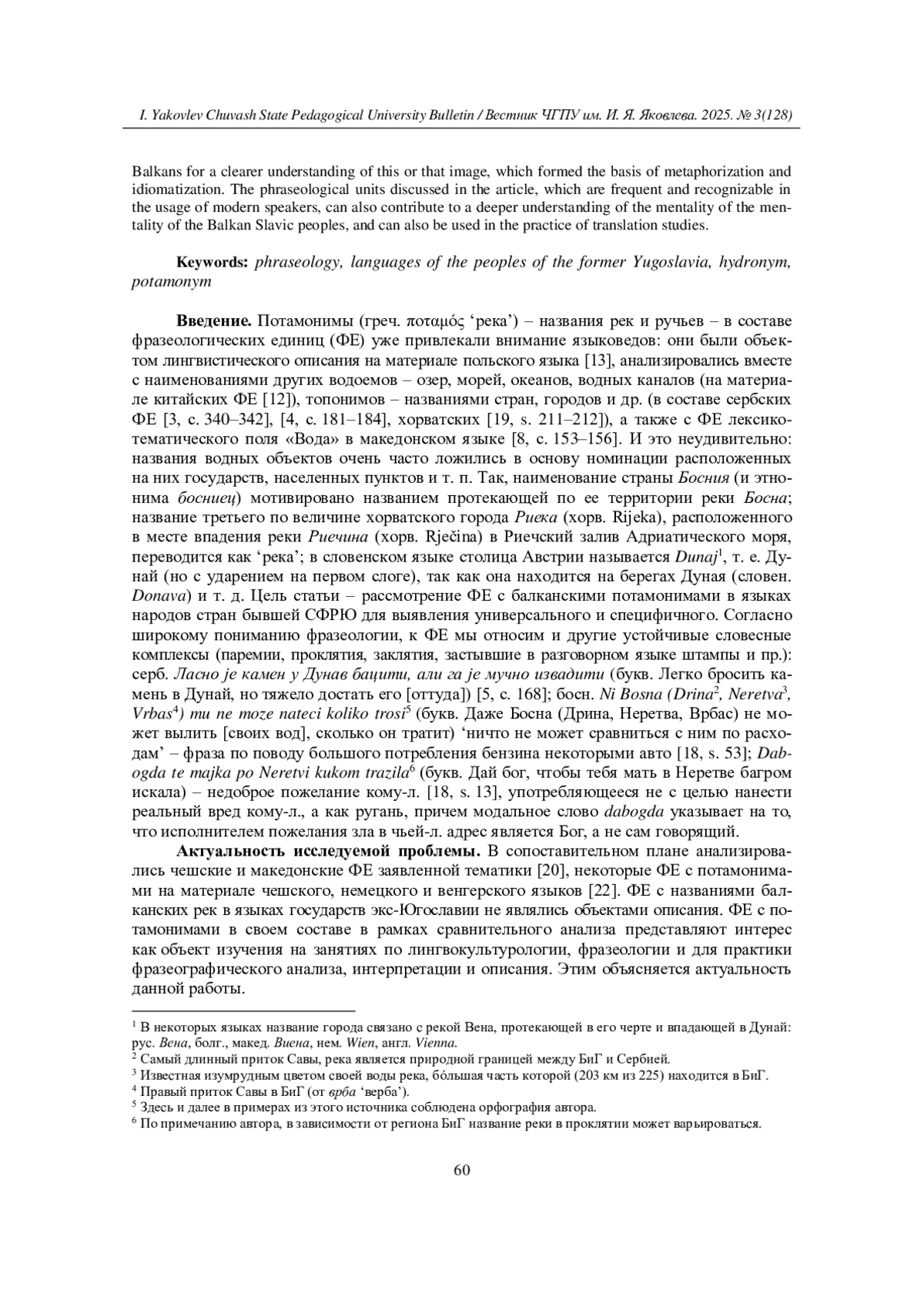 В статье анализируются с языковой и культурологической точек зрения сербские, хорватские, боснийские, македонские, словенские и черногорские фразеологические единицы с компонентами-потамонимами. Названия рек из сугубо географических понятий концептуализировались в этих южнославянских языках, прочно вошли в менталитет их носителей. Это, бесспорно, отразилось в экспрессивно-выразительных фразеологических единицах, рассмотрение которых и является предметом данного исследования. Цель статьи - изучение фразеологизмов с балканскими потамонимами в языках народов стран бывшей СФРЮ для выявления универсального и национально-специфического. Новизна работы заключаются в том, что южнославянские фразеологизмы с компонентами-потамонимами до сих пор не анализировались в сопоставительном плане. Методы обработки материала - компонентный, сопоставительный, сплошной выборки из разных источников, а также записи современной разговорной речи, включая сленг и жаргон. В статье представлены фоновые зарисовки о гидронимике славянских Балкан для более четкого понимания того или иного образа, который лег в основу метафоризации и идиоматизации. Рассмотренные в статье частотные и узнаваемые в узусе современных носителей фразеологизмы могут также поспособствовать более глубокому пониманию менталитета балканских славянских народов, а также быть использованы в практике переводоведения.