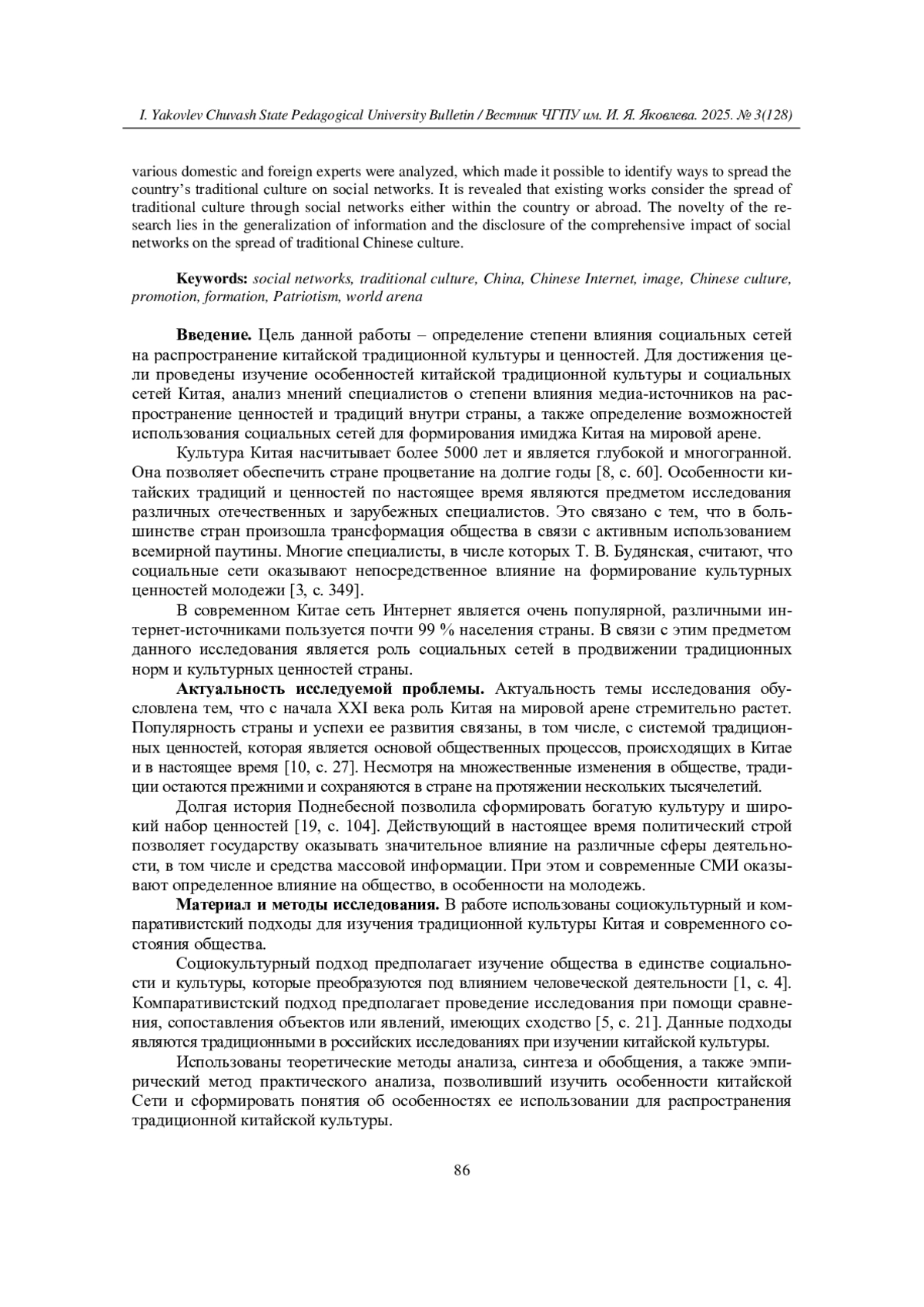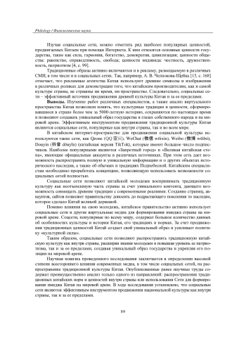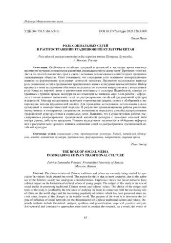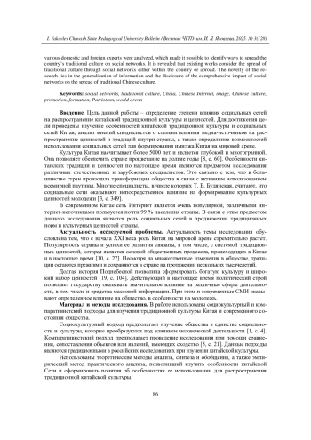 Особенности китайских традиций и ценностей в настоящее время являются предметом изучения специалистов различных специальностей по всему миру. Причиной этого является то, что в большинстве стран в связи с активным использованием сети Интернет произошла трансформация общества. Опыт показывает, что социальные сети оказывают непосредственное влияние на формирование культурных ценностей молодежи. Предметом исследования является роль социальных сетей в продвижении традиционных норм и культурных ценностей Китая. Выбор предмета и темы исследования обоснован актуальностью изучения вопроса в связи с возрастанием роли Китая на мировой арене и увеличением популярности культуры Поднебесной, которая сохранилась с древних времен, несмотря на все изменения во внешнем мире. Цель работы - определить степень влияния социальных сетей на распространение китайской традиционной культуры и ценностей. Методы исследования включают теоретические (анализ, синтез и обобщение) и эмпирические методы (практический анализ). Для проведения исследования использованы социокультурный и компаративистский подходы. В результате проанализированы работы различных отечественных и иностранных специалистов, позволившие определить способы распространения традиционной культуры Китая в социальных сетях. Выявлено, что в существующих работах рассматривается распространение традиционной китайской культуры с помощью соцсетей либо внутри страны, либо за ее пределами. Новизна исследования заключается в обобщении информации и раскрытии всестороннего влияния социальных сетей на распространение традиционной китайской культуры.
