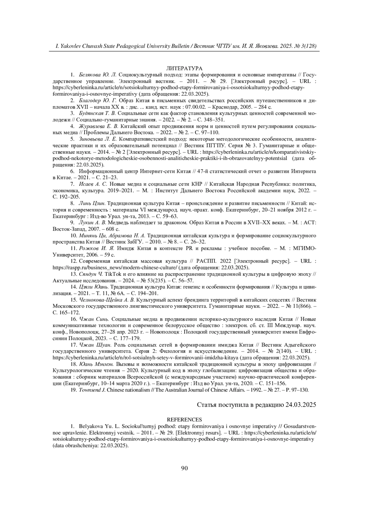 10. Минянь Ци, Абрамова Н. А. Традиционная китайская культура и формирование социокультурного пространства Китая // Вестник ЗабГУ. - 2010. - № 8. - С. 26-32. EDN: MWLRDJ