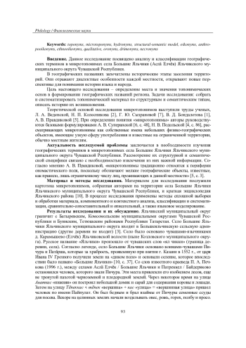 В статье проводится исследование географических терминов в рамках микротопонимов села Большие Яльчики Яльчикского муниципального округа Чувашской Республики. Географические наименования служат своего рода летописью, сохраняя информацию об исторических периодах освоения земель и отражая уникальные диалектные характеристики каждой конкретной местности. Этот факт создает новые возможности для изучения истории языка и этноса. Необходимость изучения географической лексики, содержащейся в названиях небольших объектов (микротопонимах) села, определяет актуальность представленной работы. Анализ места и времени появления и развития географических названий позволяет более подробно восстановить исторические особенности данной местности. Новизна работы заключается в том, что анализируемый фактический материал, отражающий виды географических объектов, рассматривается впервые. Для проведения исследования были использованы методы классификации и систематизации, сравнительного анализа и описательный, а также лингвистическое моделирование. В работе были изучены различные типы географических наименований. Важно подчеркнуть, что микротопонимы по своей природе ближе к обыденным словам, нежели к официальным топонимам. Для жителей конкретной деревни или села они уже являются полноценными географическими названиями.