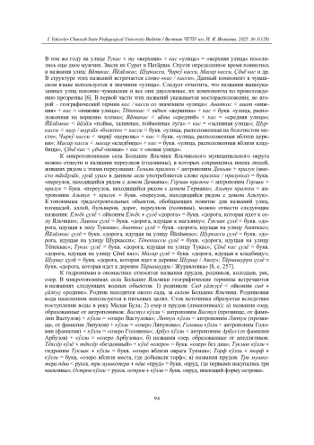 Данное исследование посвящено анализу и классификации географических терминов в микротопонимах села Большие Яльчики (Аслă Елчĕк) Яльчикского муниципального округа Чувашской Республики.