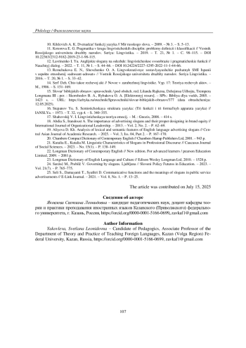 21. Kutalia E., Kutalia M. Linguistic Characteristics of Slogans in Professional Discourse // Caucasus Journal of Social Sciences. - 2023. - No. 15(1). - P. 138-149.