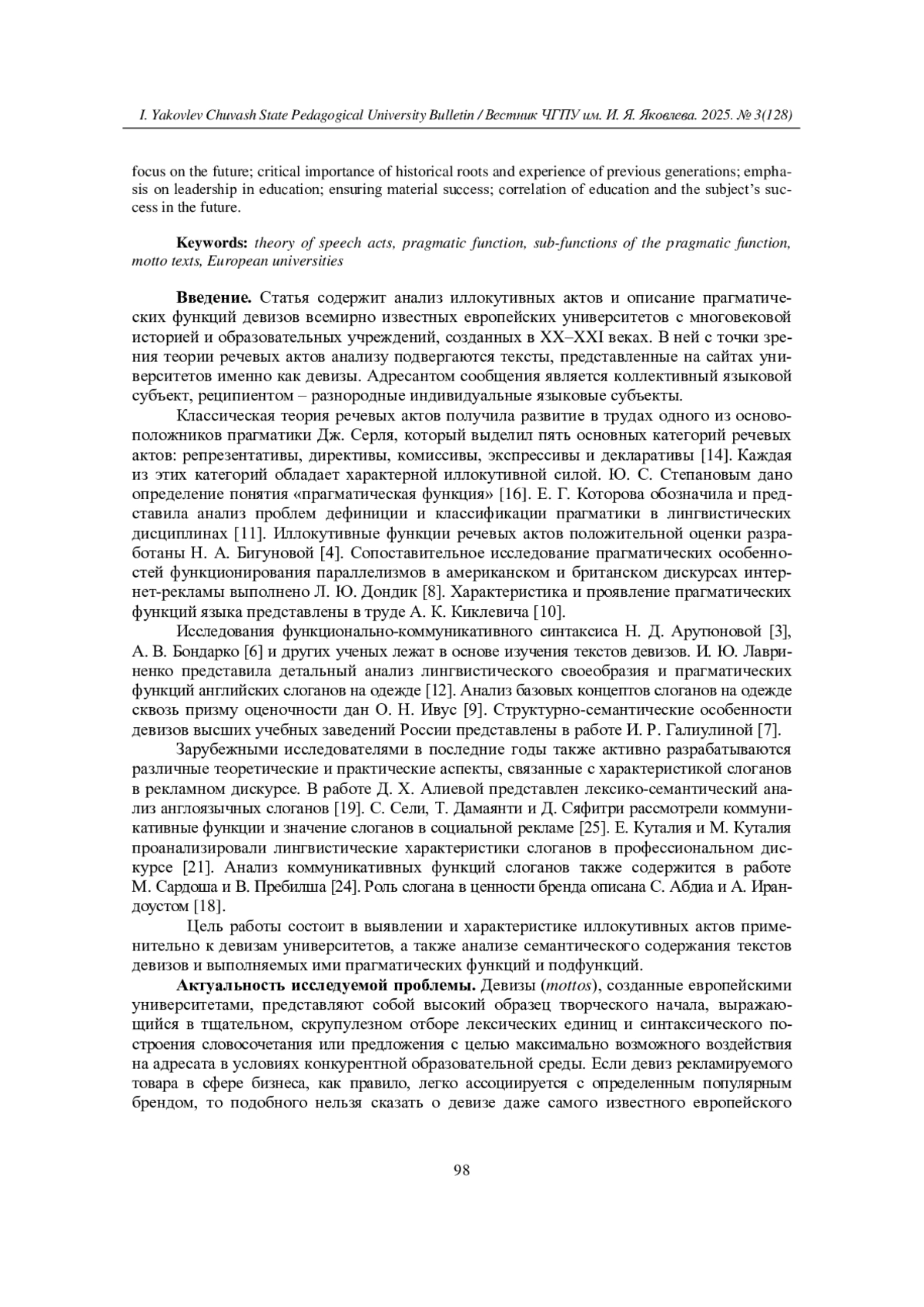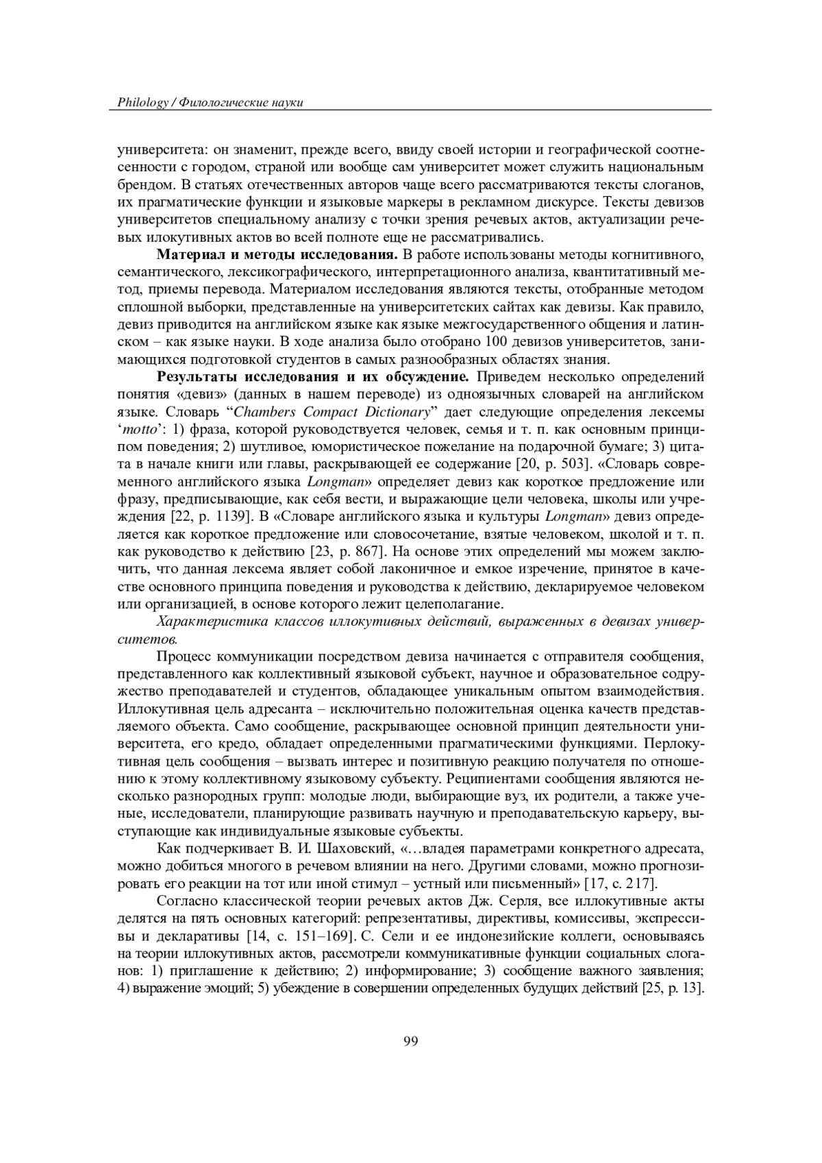 В статье анализируются тексты девизов (mottos) европейских вузов, в которых сложилась устойчивая традиция формулировать изречение, раскрывающее принцип, ценности и цели образовательного учреждения. Следует различать понятие слогана и девиза. Девиз университета - это лаконичное и емкое изречение, принятое в качестве основного принципа поведения и руководства к действию, в основе которого лежит целеполагание. Актуальность исследования обусловлена комплексным подходом к рассмотрению текстов девизов на основе характеристики иллокутивных актов и семантического анализа их содержания. Методы исследования включают когнитивный, семантический, лексикографический, интерпретационный анализ, квантитативный метод, приемы перевода. Анализ речевых актов текстов девизов выявил наличие в них трех групп иллокутивных актов: репрезентативов, директивов и комиссивов. Основными прагматическими функциями текстов девизов являются функция самопрезентации и функция воздействия на получателя сообщения. Семантический анализ содержания текстов позволил выявить также такие прагматические функции девизов, как образовательная, информативная, социально-маркирующая, мемориальная, инспиративная, контактоустанавливающая, апеллятивная. Подфункциями прагматических функций являются: актуализация роли знаний в современном мире; синергия образования, фундаментальных наук и прикладных исследований; возможность для самосовершенствования, развития талантов; установка на будущее; критическая значимость исторических корней, опыта предыдущих поколений; акцент на лидерских позициях в сфере образования; обеспечение материального успеха; корреляция образования и удачи субъекта в будущем.