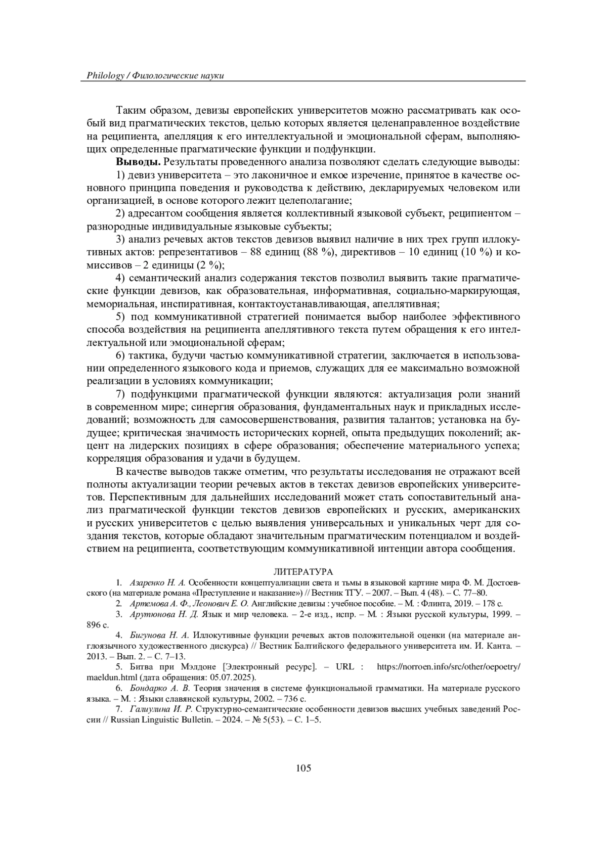 7. Галиулина И. Р. Структурно-семантические особенности девизов высших учебных заведений России // Russian Linguistic Bulletin. - 2024. - № 5(53). - С. 1-5. EDN: HSEAHJ