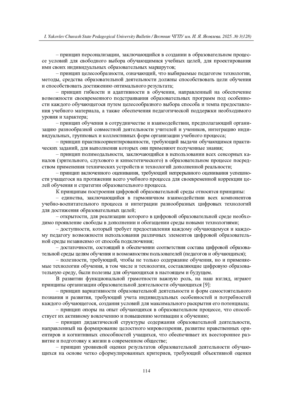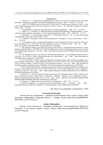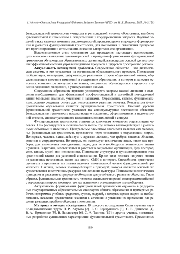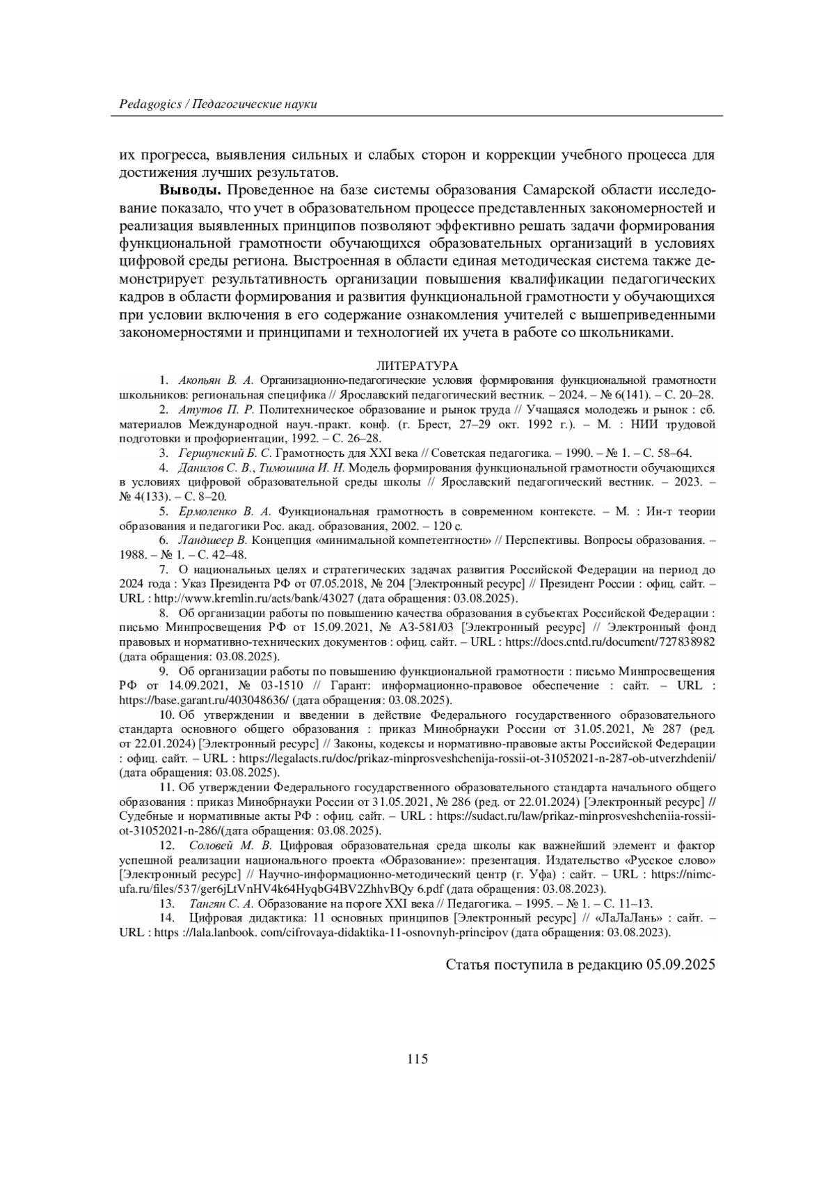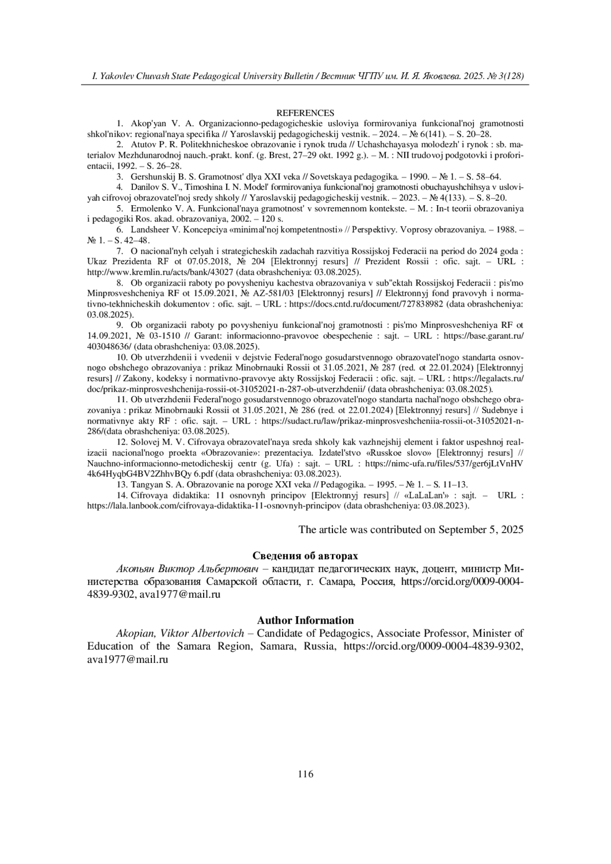 1. Акопьян В. А. Организационно-педагогические условия формирования функциональной грамотности школьников: региональная специфика // Ярославский педагогический вестник. - 2024. - № 6(141). - С. 20-28. EDN: YHQCPW