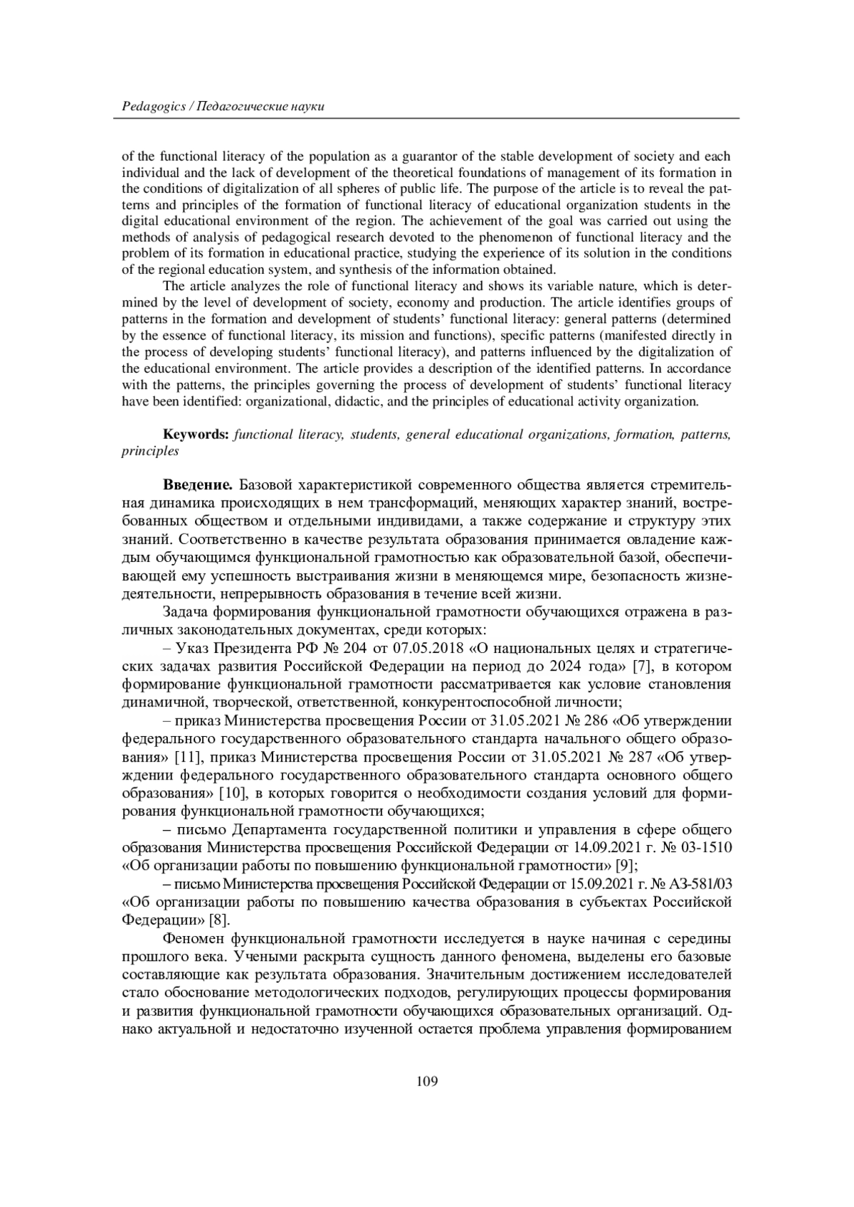 Раскрыты роль и функции функциональной грамотности, показан ее вариативный характер, определяемый уровнем развития общества, экономики и производства. Выявлены группы закономерностей формирования и развития функциональной грамотности обучающихся: общих (обусловленных сущностью функциональной грамотности и ее миссией), частных (проявляющихся непосредственно в процессе формирования функциональной грамотности обучающихся) и обусловленных цифровизацией образовательной среды. Дана характеристика выявленных закономерностей. В соответствии с закономерностями определены принципы, регулирующие осуществление процесса формирования функциональной грамотности обучающихся: организационные, дидактические, организации образовательной деятельности обучающихся, развивающего обучения.