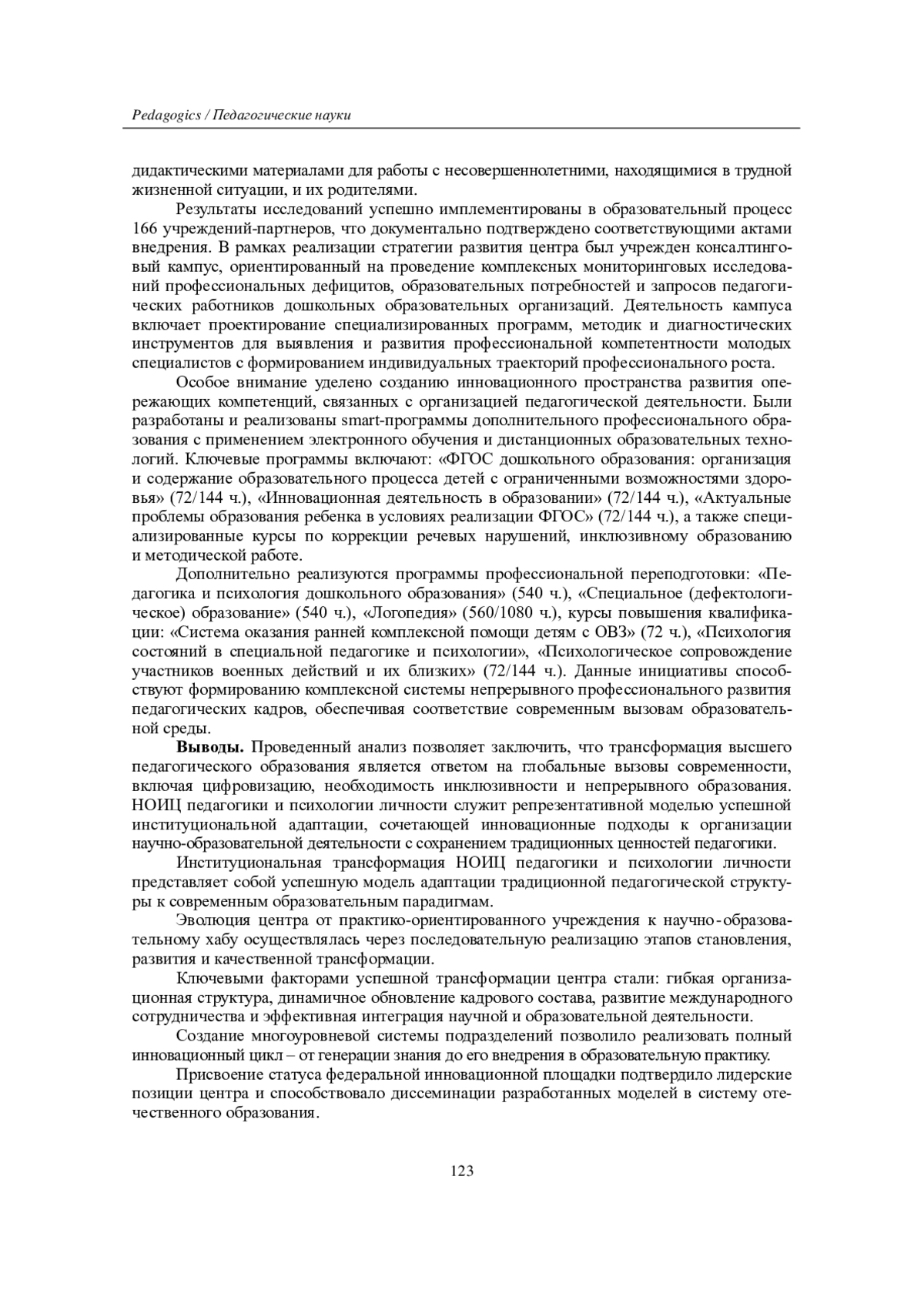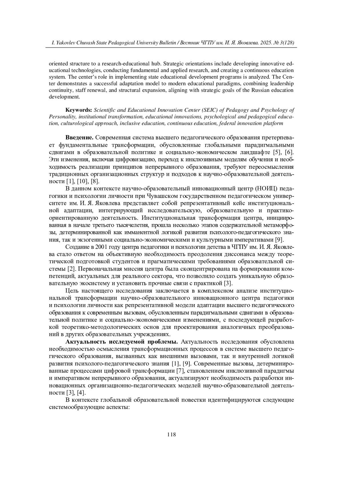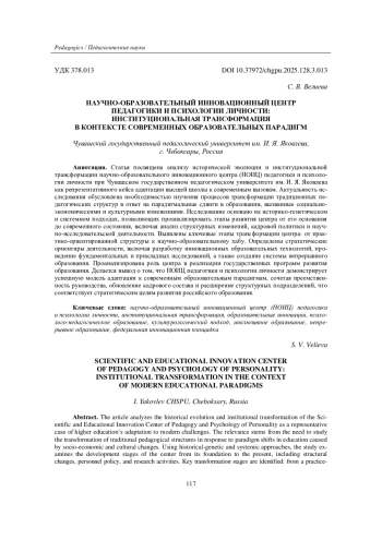 Статья посвящена анализу исторической эволюции и институциональной трансформации научно-образовательного инновационного центра (НОИЦ) педагогики и психологии личности при Чувашском государственном педагогическом университете им. И. Я. Яковлева как репрезентативного кейса адаптации высшей школы к современным вызовам. Актуальность исследования обусловлена необходимостью изучения процессов трансформации традиционных педагогических структур в ответ на парадигмальные сдвиги в образовании, вызванные социально-экономическими и культурными изменениями. Исследование основано на историко-генетическом и системном подходах, позволяющих проанализировать этапы развития центра от его основания до современного состояния, включая анализ структурных изменений, кадровой политики и научно-исследовательской деятельности. Выявлены ключевые этапы трансформации центра: от практико-ориентированной структуры к научно-образовательному хабу. Определены стратегические ориентиры деятельности, включая разработку инновационных образовательных технологий, проведение фундаментальных и прикладных исследований, а также создание системы непрерывного образования. Проанализирована роль центра в реализации государственных программ развития образования. Делается вывод о том, что НОИЦ педагогики и психологии личности демонстрирует успешную модель адаптации к современным образовательным парадигмам, сочетая преемственность руководства, обновление кадрового состава и расширение структурных подразделений, что соответствует стратегическим целям развития российского образования.