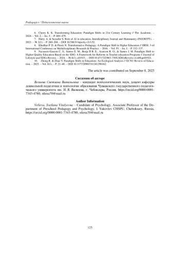 9. Navasero-Gascon C. S., Santos E. M., Borja II R. E., Azarcon R. O., & Santos J. M. Paradigm Shift to Higher-Quality Education Based on the SDG: A Framework for Reforms in Teacher education Programs // Journal of Lifestyle and SDGs Review. - 2024. - № 4(1). e01921. DOI: 10.47172/2965-730X.SDGsReview.v4.n00.pe01921 EDN: PTKMOV