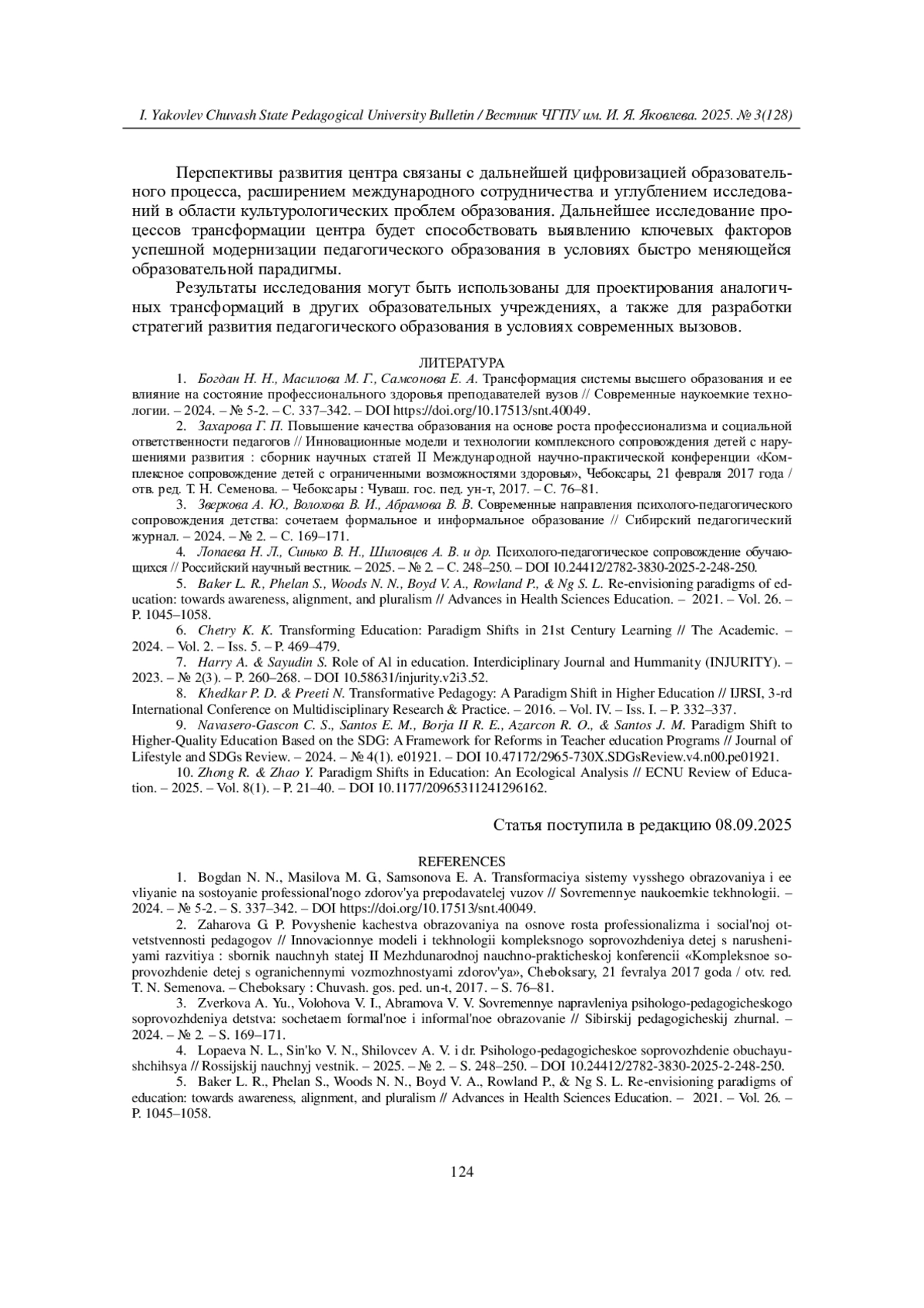 1. Богдан Н. Н., Масилова М. Г., Самсонова Е. А. Трансформация системы высшего образования и ее влияние на состояние профессионального здоровья преподавателей вузов // Современные наукоемкие технологии. - 2024. - № 5-2. - С. 337-342. DOI: 10.17513/snt.40049 EDN: DLGPEM