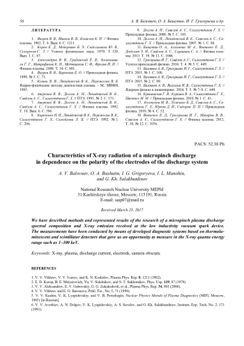 A. V. Balovnev, O. A. Bashutin, I. G. Grigoryeva, I. L. Manohin, and G. Kh. Salakhutdinov Characteristics of X-ray radiation of a micropinch discharge in dependence on the polarity of the electrodes of the discharge system 52