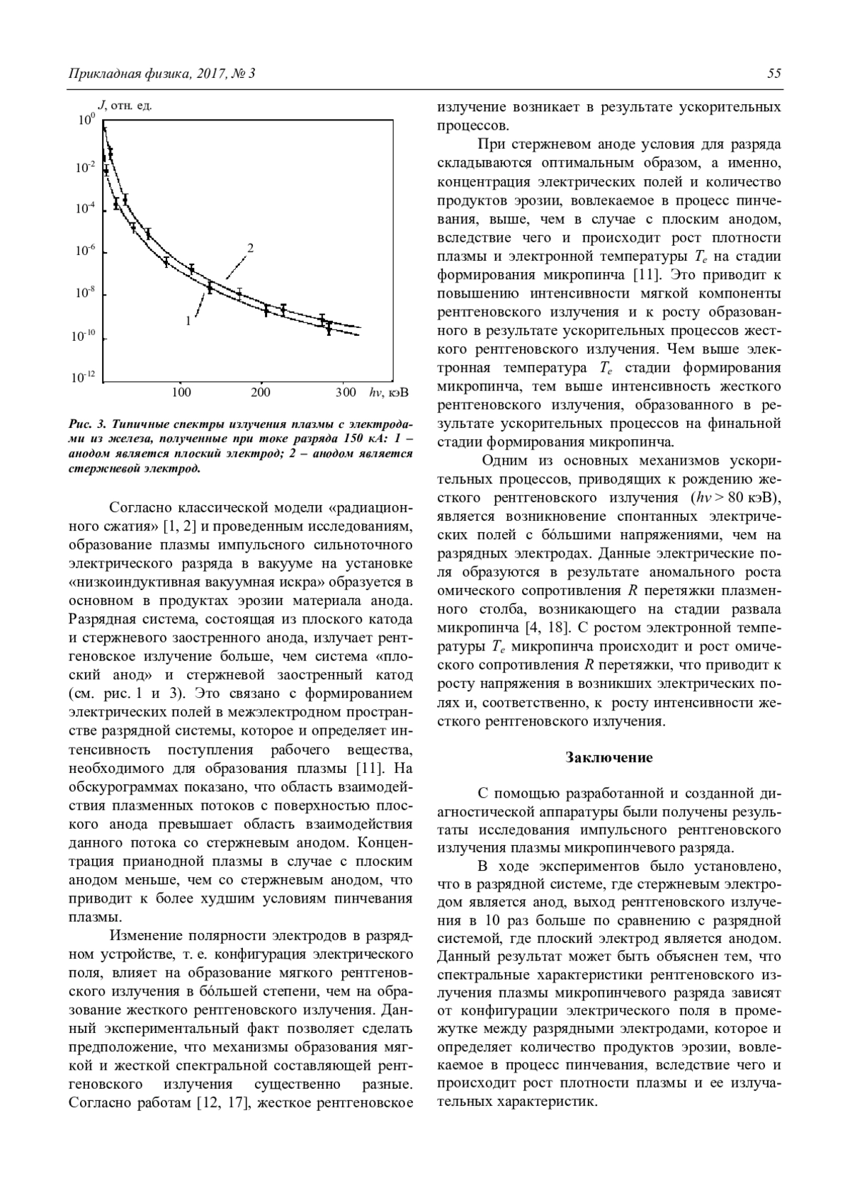 В ходе экспериментов было установлено, что в разрядной системе, где стержневым электродом является анод, выход рентгеновского излучения в 10 раз больше по сравнению с разрядной системой, где плоский электрод является анодом. Данный результат может быть объяснен тем, что спектральные характеристики рентгеновского излучения плазмы микропинчевого разряда зависят от конфигурации электрического поля в промежутке между разрядными электродами, которое и определяет количество продуктов эрозии, вовлекаемое в процесс пинчевания, вследствие чего и происходит рост плотности плазмы и ее излучательных характеристик.