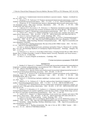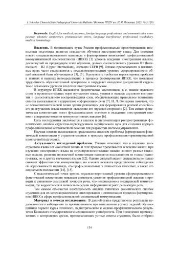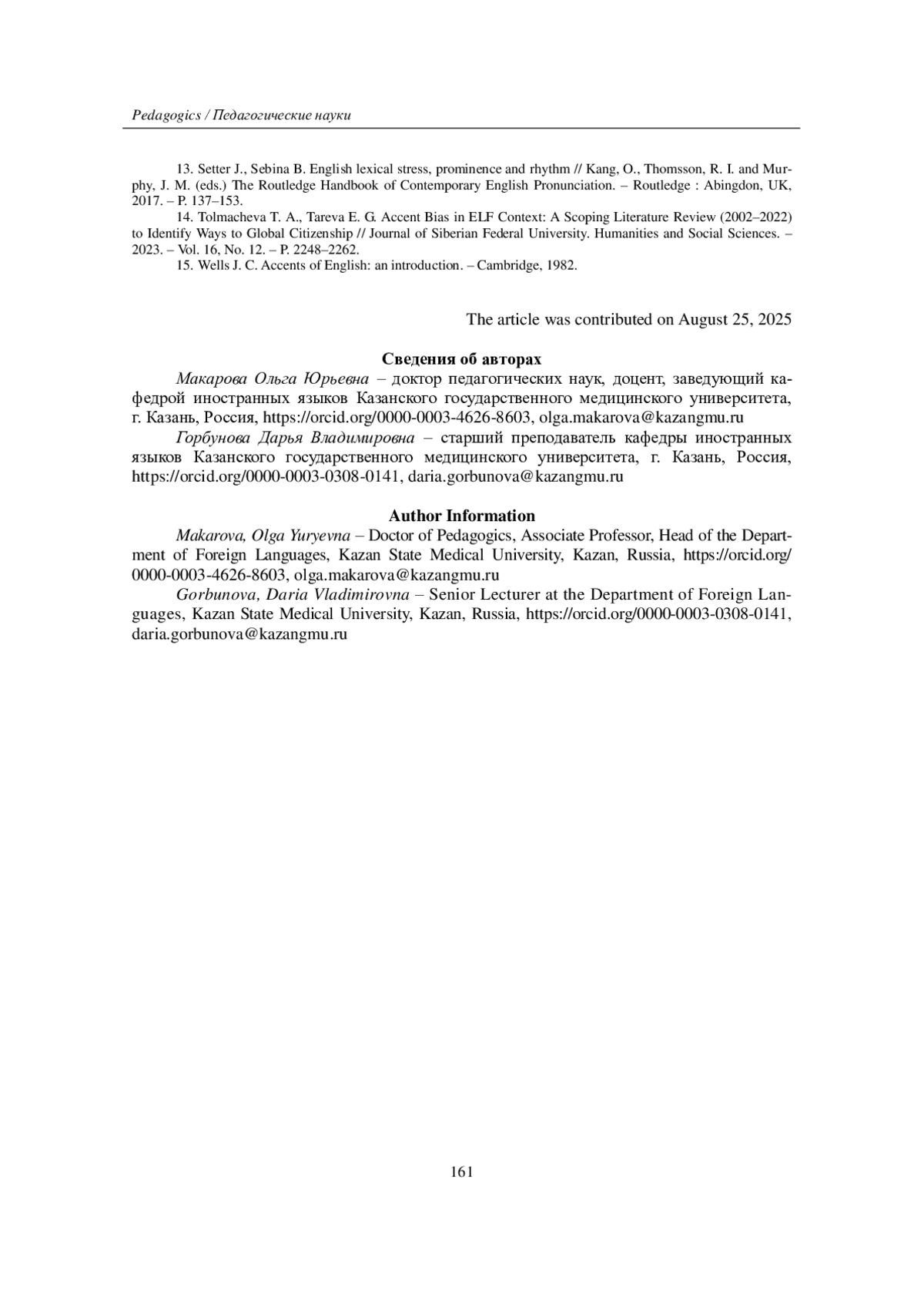 5. Макарова О. Ю., Горбунова Д. В. Развитие англоязычной фонетической компетенции у студентов-медиков // Казанский педагогический журнал. - 2025. - Т. 31, № 1. - С. 25-42. DOI: 10.11621/KPJ-25-02 EDN: DUVXAU