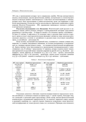 Фонетический аспект обучения иностранному языку играет важную роль в постановке произношения, развитии лексических и речевых умений, формировании навыка восприятия живой речи, в том числе в профессиональном контексте. Актуальность статьи заключается в необходимости анализа фонетических ошибок и создания перечня слов для модернизации содержания профессионально-ориентированной иноязычной подготовки в медицинском вузе. Материалом исследования послужили 100 наиболее частотных слов, выявленных в процессе долгосрочного педагогического наблюдения. Были применены методы контрастивного анализа, интроспекции, анализа фонетических ошибок, методического и статистического анализа. В качестве модели выбрано нормативное британское произношение (RP), являющееся стандартом в учебных материалах. Выявлено, что наибольшие затруднения для студентов представляют различия в фонетическом строе английского и русского языков (в частности, гласные звуки, их долгота и краткость), фонетическая интерференция русского и латинского языков, произношение определенных суффиксов, непроизносимые буквы, словесное ударение. В результате проведенного анализа и классификации слова были представлены в таблицах, которые могут быть использованы как самостоятельный учебно-методический материал и как база для разработки системы фонетических упражнений для работы над произношением на основе актуальной лексики.