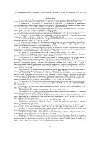 15. Латышева М. А., Абдулмеджиева А. М. Кызы. Субъектность личности как основа развития профессиональной идентичности психологов на этапе обучения // Ученые записки Крымского федерального университета им. В. И. Вернадского. Социология. Педагогика. Психология. - 2023. - № 2(75). - С. 139-150. EDN: WIYDAP