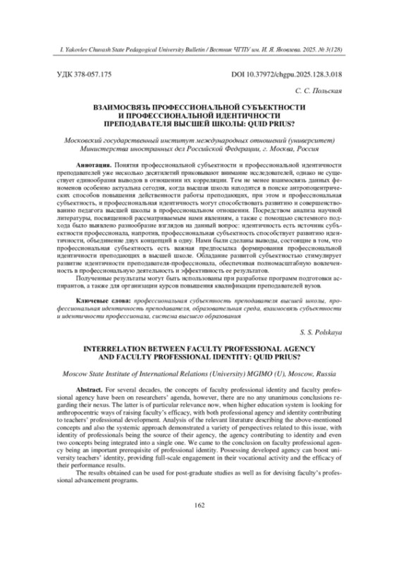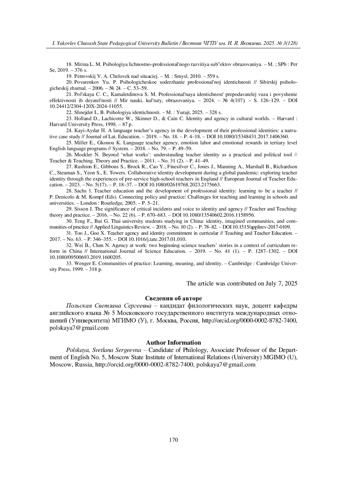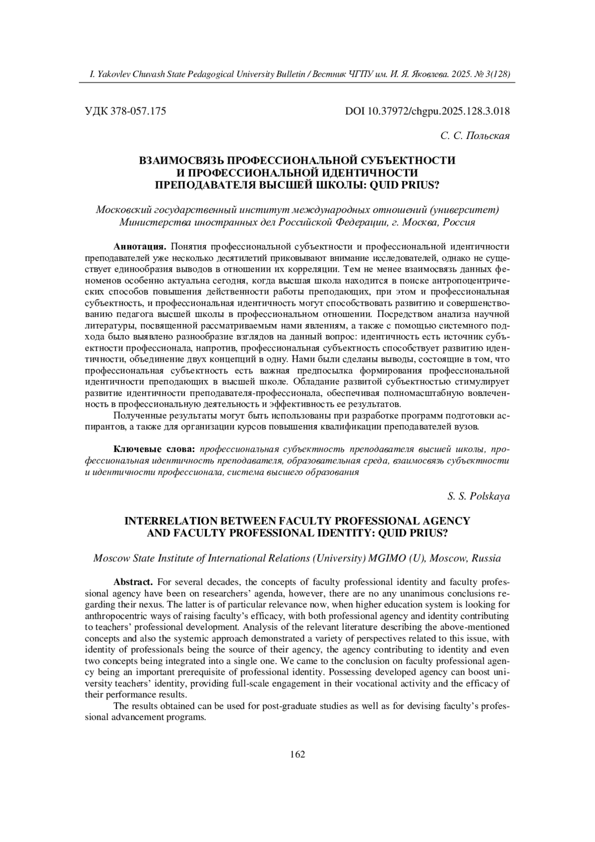 21. Польская C. C., Камалетдинова С. М. Профессиональная идентичность преподавателей вуза и повышение эффективности их деятельности // Мир науки, культуры, образования. - 2024. - № 4(107). - С. 126-129. DOI: 10.24412/2304-120X-2024-11055 EDN: VHQWPZ