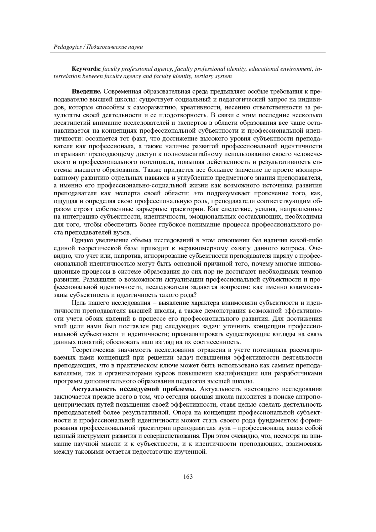 Понятия профессиональной субъектности и профессиональной идентичности преподавателей уже несколько десятилетий приковывают внимание исследователей, однако не существует единообразия выводов в отношении их корреляции. Тем не менее взаимосвязь данных феноменов особенно актуальна сегодня, когда высшая школа находится в поиске антропоцентрических способов повышения действенности работы преподающих, при этом и профессиональная субъектность, и профессиональная идентичность могут способствовать развитию и совершенствованию педагога высшей школы в профессиональном отношении. Посредством анализа научной литературы, посвященной рассматриваемым нами явлениям, а также с помощью системного подхода было выявлено разнообразие взглядов на данный вопрос: идентичность есть источник субъектности профессионала, напротив, профессиональная субъектность способствует развитию идентичности, объединение двух концепций в одну. Нами были сделаны выводы, состоящие в том, что профессиональная субъектность есть важная предпосылка формирования профессиональной идентичности преподающих в высшей школе. Обладание развитой субъектностью стимулирует развитие идентичности преподавателя-профессионала, обеспечивая полномасштабную вовлеченность в профессиональную деятельность и эффективность ее результатов. Полученные результаты могут быть использованы при разработке программ подготовки аспирантов, а также для организации курсов повышения квалификации преподавателей вузов.