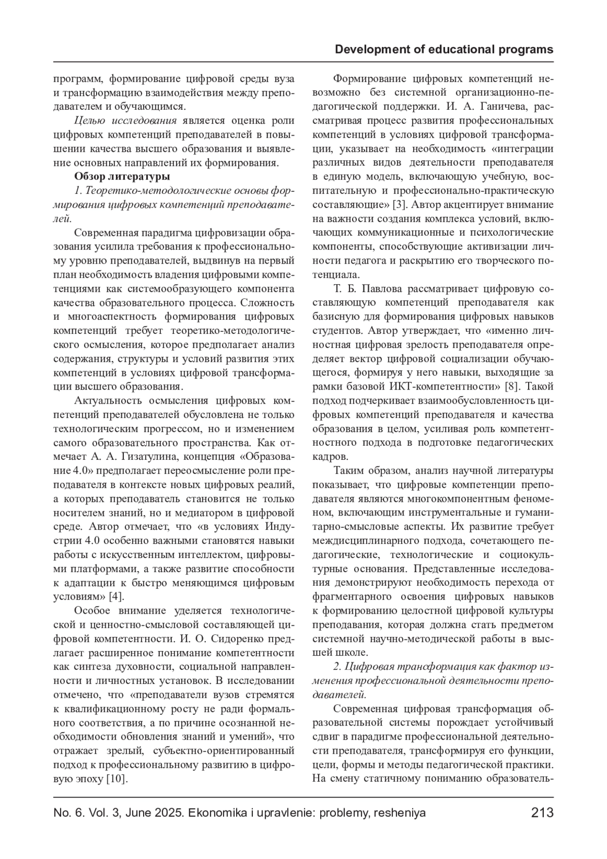 8. Павлова Т. Б. Цифровые составляющие компетенций преподавателя вуза как фактор развития цифровых компетенций студентов // Известия Волгоградского государственного педагогического университета. - 2023. - № 7(180). - С. 74-80. EDN: WRTKMY