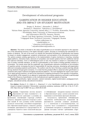 Целью работы является выявление теоретических оснований геймификации и оценка её влияния на вовлечённость обучающихся, их академические достижения и восприятие образовательной среды. Авторы анализируют существующие подходы к внедрению игровых механик в преподавание, включая цифровые платформы, интерактивные задания, элементы конкуренции и системы вознаграждений, формирующие дополнительную внутреннюю и внешнюю мотивацию. В методологическом аспекте исследование базируется на теоретическом анализе современной научной литературы, а также обобщении результатов апробации геймифицированных решений в вузах. Полученные результаты показывают, что систематическое применение элементов геймификации способствует активизации познавательной деятельности, повышению уровня ответственности за учебные результаты, развитию навыков самоорганизации и росту академической успеваемости. Авторы отмечают роль формирования у студентов позитивного учебного настроя через игровые сценарии. Отмечено, что наибольший эффект наблюдается при сочетании геймификации с проектными методами и цифровыми образовательными платформами. Работа подчёркивает необходимость подготовки преподавателей к применению игровых практик, а также важность адаптации методик к специфике дисциплин. Особенность исследования заключается в попытке систематизации имеющегося опыта и построении обоснованной модели влияния геймификации на мотивационные и когнитивные аспекты обучения.