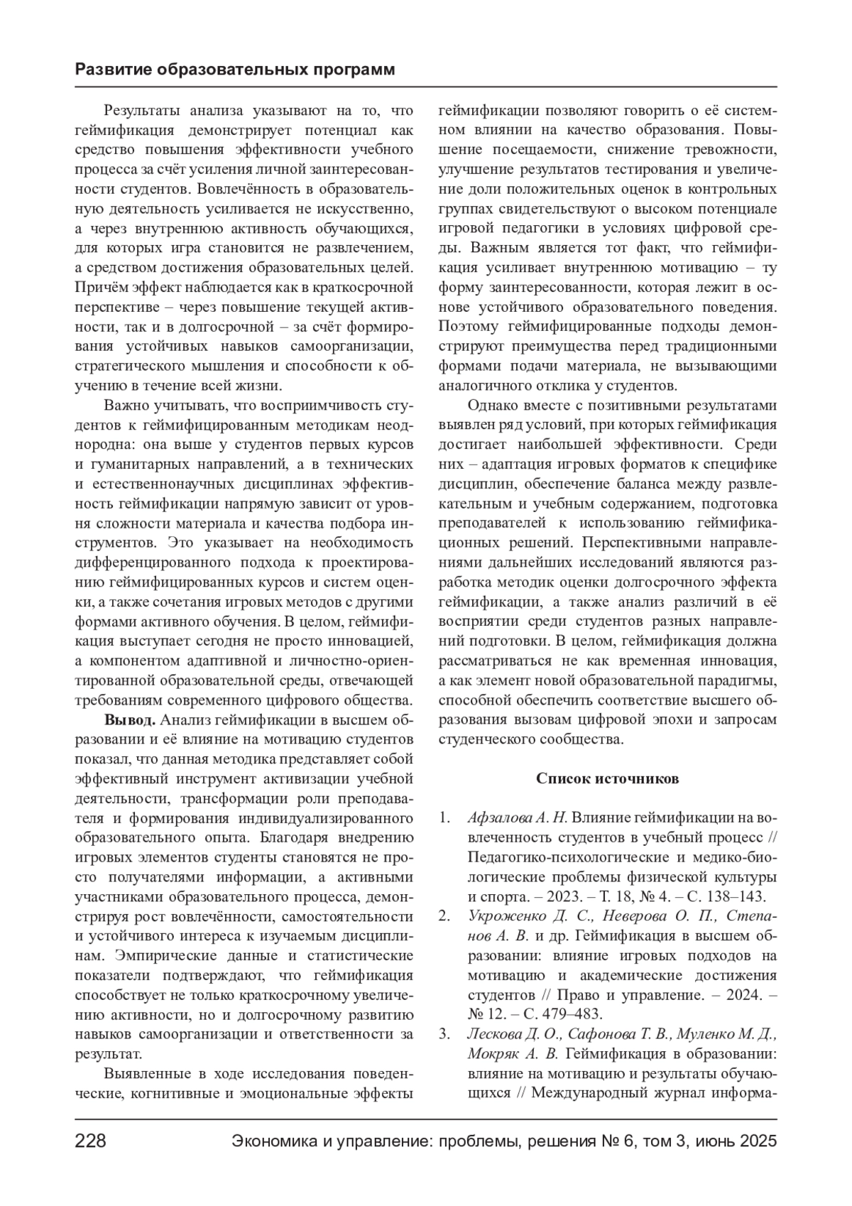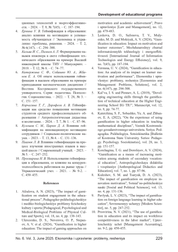 1. Афзалова А. Н. Влияние геймификации на вовлеченность студентов в учебный процесс // Педагогико-психологические и медико-биологические проблемы физической культуры и спорта. - 2023. - Т. 18, № 4. - С. 138-143. EDN: QUPRUH