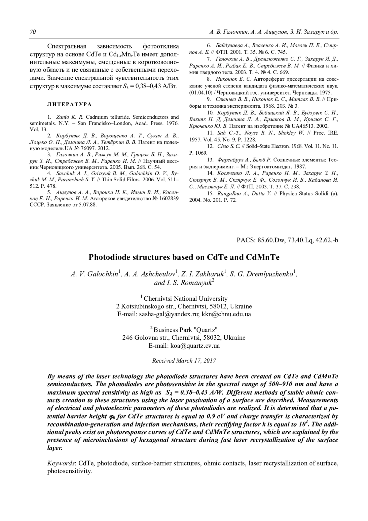 A. V. Galochkin, A. A. Ashcheulov, Z. I. Zakharuk, S. G. Dremlyuzhenko and I. S. Romanyuk Photodiode structures based on CdTe and CdMnTe 65