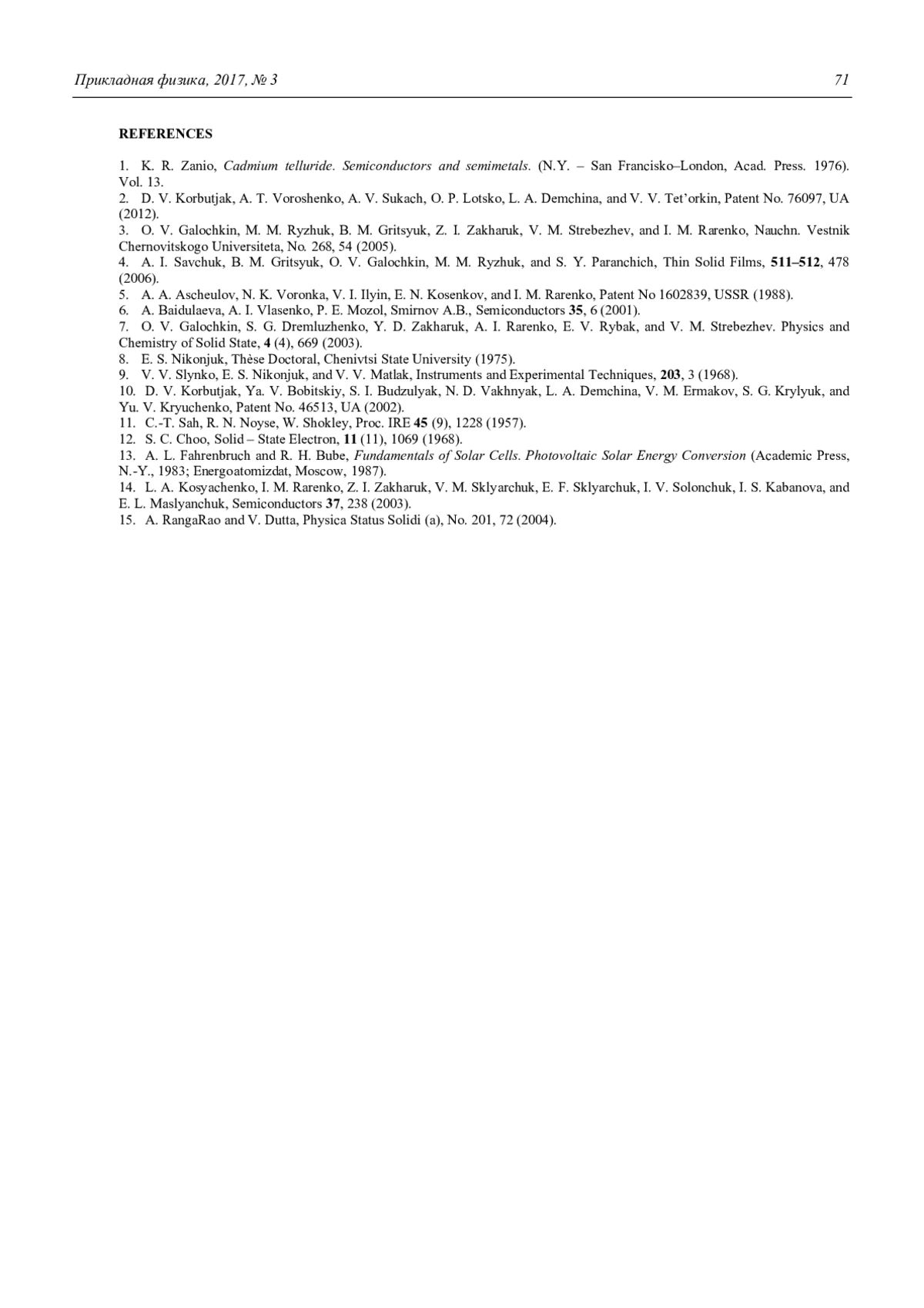 14. Косяченко Л. А., Раренко И. М., Захарук З. И., Склярчук В. М., Склярчук Е. Ф., Солончук И. В., Кабанова И. С., Маслянчук Е. Л. // ФТП. 2003. Т. 37. C. 238.