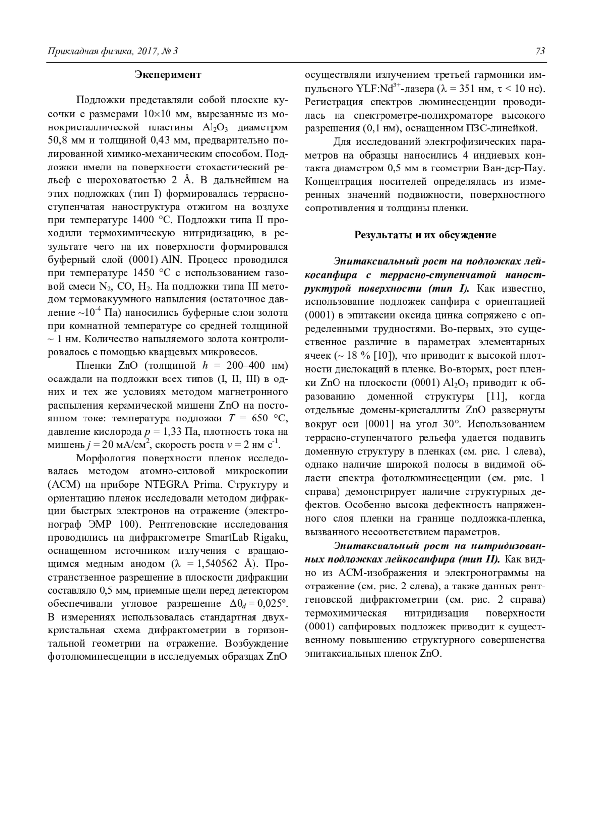 Проведенные исследования показывают, что использование подложек сапфира с террасно-ступенчатой наноструктурой в эпитаксии ZnO позволяет подавить доменную структуру, однако из-за несоответствия параметров решеток ZnO и сапфира формируется дефектная переходная область. Сравнительно высокие значения подвижности и концентрации носителей в таких пленках позволяют предположить, что переходный слой является поставщиком носителей заряда, а высокая подвижность обеспечивается верхними более совершенными слоями (модель двуслойной сверхрешетки).