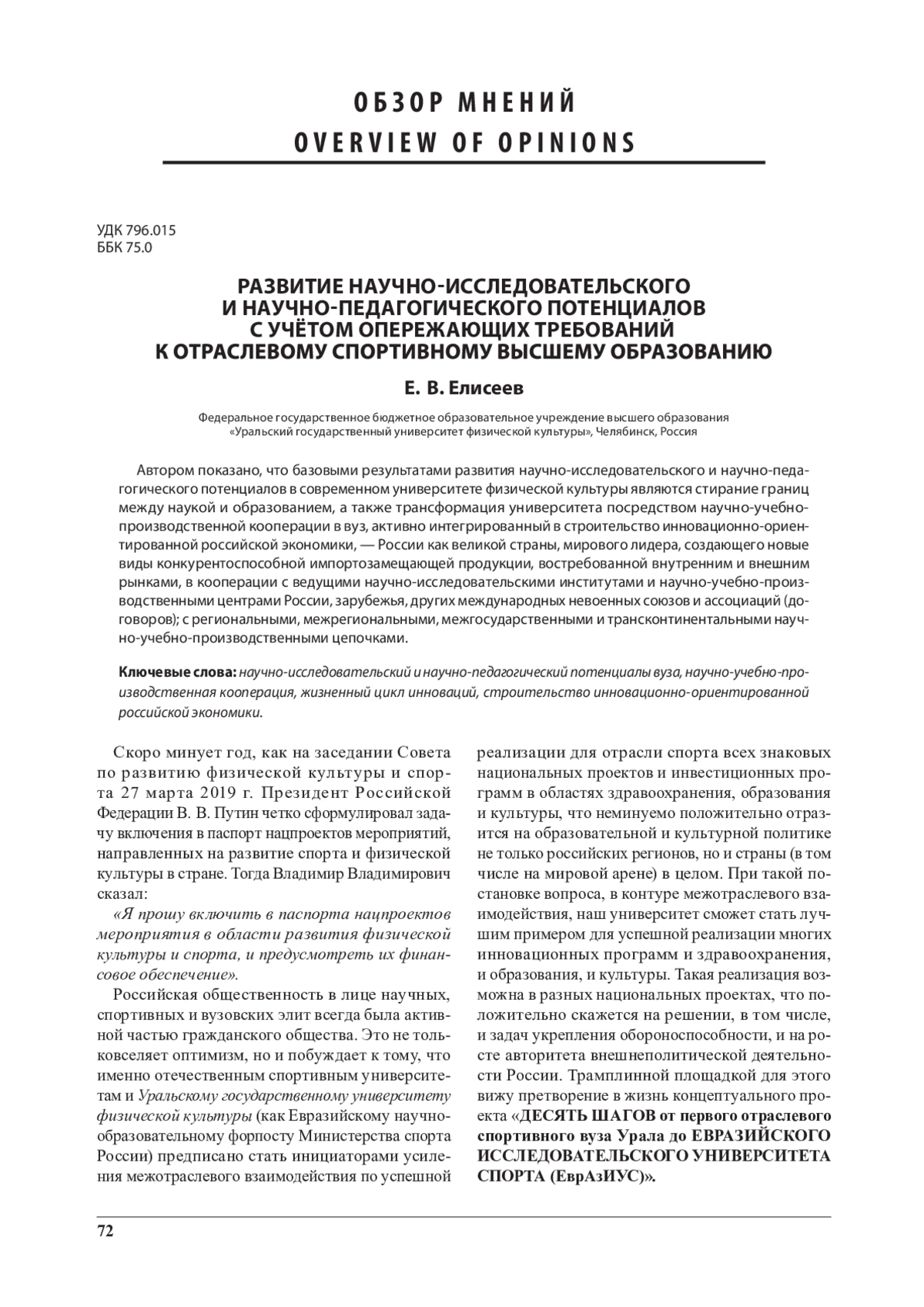 12. Елисеев, Е. В. ДЕСЯТЬ ШАГОВ от первого отраслевого спортивного вуза Урала до ЕВРАЗИЙ- СКОГО ИССЛЕДОВАТЕЛЬСКОГО УНИВЕРСИТЕТА СПОРТА (ЕврАзИУС) / Е. В. Елисеев // Автореферат концептуального проекта. - Челябинск, 2019. - 32 с.