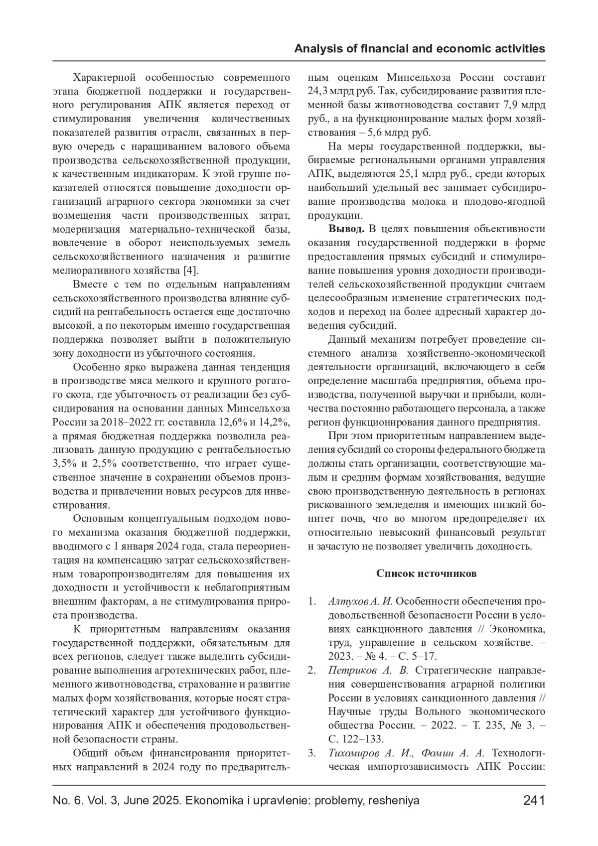 2. Петриков А. В. Стратегические направления совершенствования аграрной политики России в условиях санкционного давления // Научные труды Вольного экономического общества России. - 2022. - Т. 235, № 3. - С. 122-133. EDN: EATOKW