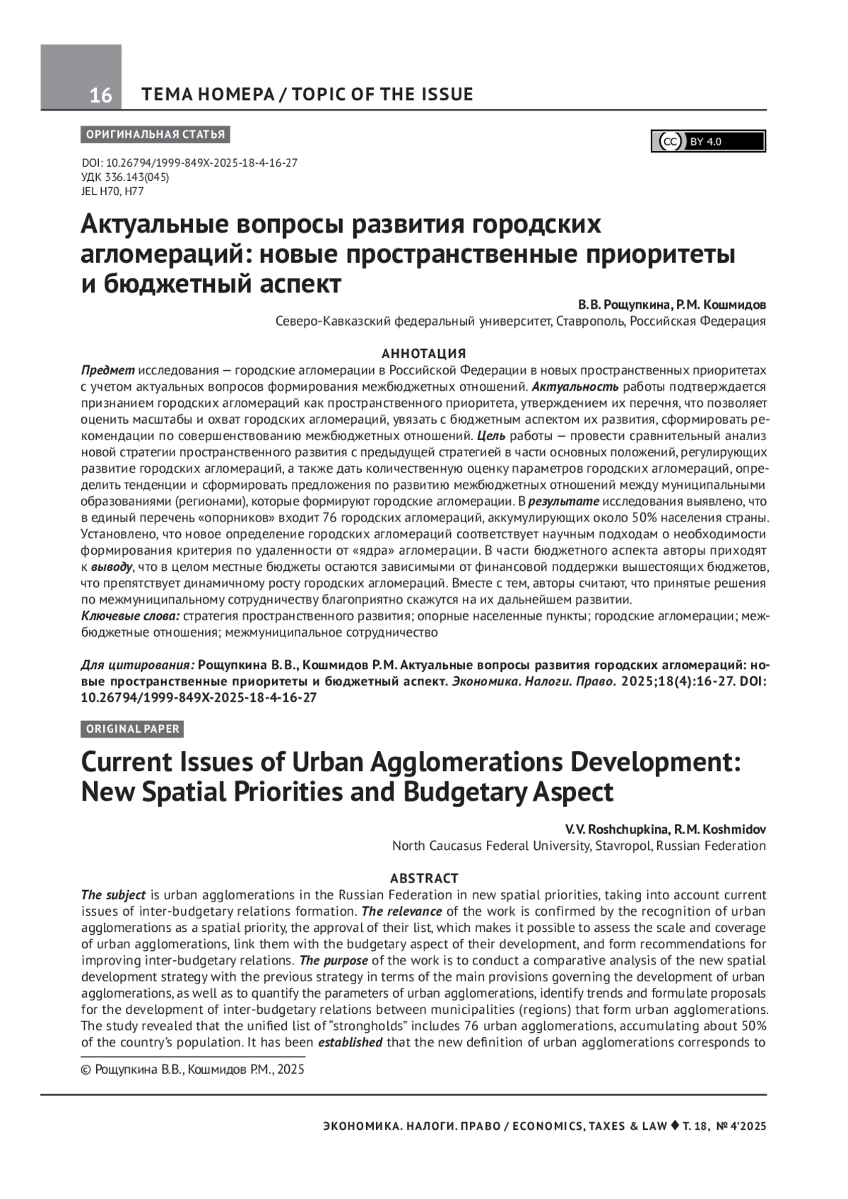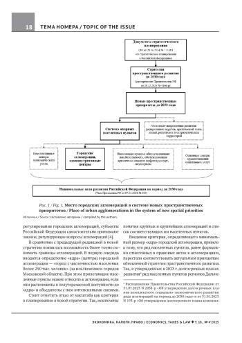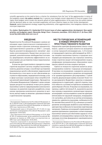 Предмет исследования — городские агломерации в Российской Федерации в новых пространственных приоритетах с учетом актуальных вопросов формирования межбюджетных отношений. Актуальность работы подтверждается признанием городских агломераций как пространственного приоритета, утверждением их перечня, что позволяет оценить масштабы и охват городских агломераций, увязать с бюджетным аспектом их развития, сформировать рекомендации по совершенствованию межбюджетных отношений. Цель работы — провести сравнительный анализ новой стратегии пространственного развития с предыдущей стратегией в части основных положений, регулирующих развитие городских агломераций, а также дать количественную оценку параметров городских агломераций, определить тенденции и сформировать предложения по развитию межбюджетных отношений между муниципальными образованиями (регионами), которые формируют городские агломерации. В результате исследования выявлено, что в единый перечень «опорников» входит 76 городских агломераций, аккумулирующих около 50% населения страны. Установлено, что новое определение городских агломераций соответствует научным подходам о необходимости формирования критерия по удаленности от «ядра» агломерации. В части бюджетного аспекта авторы приходят к выводу, что в целом местные бюджеты остаются зависимыми от финансовой поддержки вышестоящих бюджетов, что препятствует динамичному росту городских агломераций. Вместе с тем, авторы считают, что принятые решения по межмуниципальному сотрудничеству благоприятно скажутся на их дальнейшем развитии