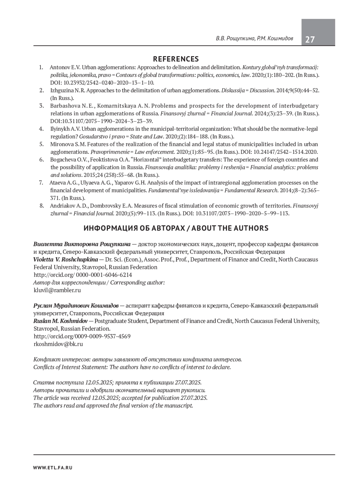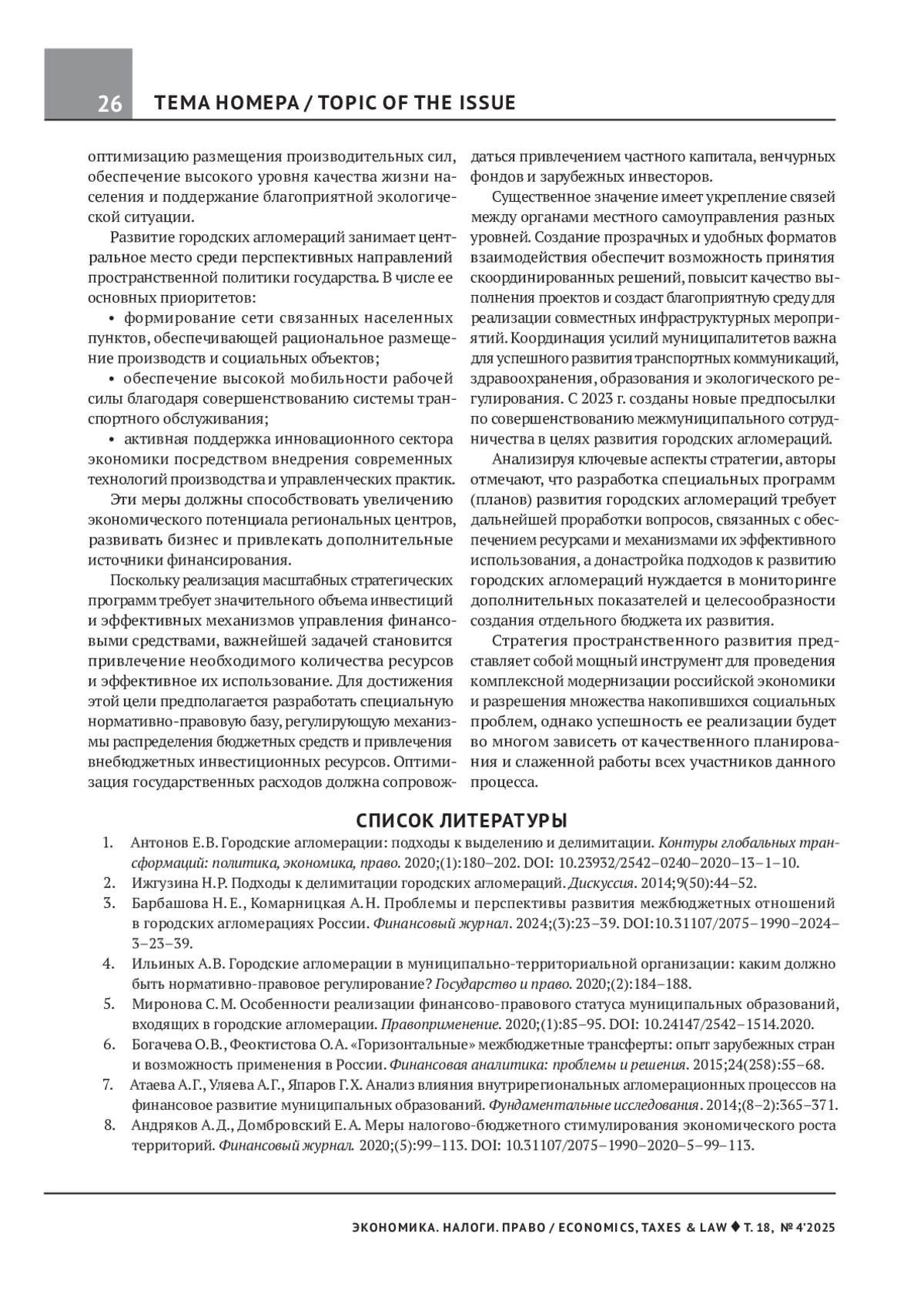 5. Миронова С.М. Особенности реализации финансово-правового статуса муниципальных образований, входящих в городские агломерации. Правоприменение. 2020;(1):85-95. DOI: 10.24147/2542-1514.2020 EDN: QEOPPC