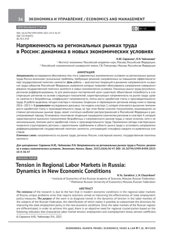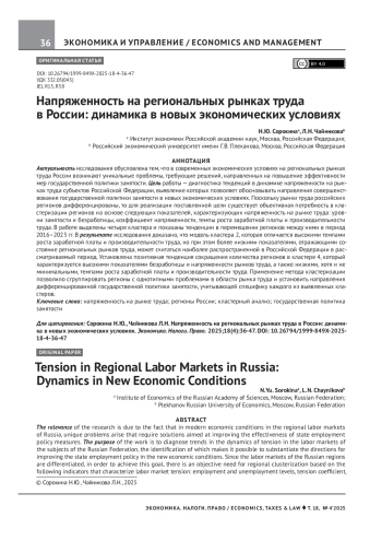 Актуальность исследования обусловлена тем, что в современных экономических условиях на региональных рынках труда России возникают уникальные проблемы, требующие решений, направленных на повышение эффективности мер государственной политики занятости. Цель работы — диагностика тенденций в динамике напряженности на рынках труда субъектов Российской Федерации, выявление которых позволяет обосновывать направления совершенствования государственной политики занятости в новых экономических условиях. Поскольку рынки труда российских регионов дифференцированы, то для реализации поставленной цели существует объективная потребность в кластеризации регионов на основе следующих показателей, характеризующих напряженность на рынке труда: уровни занятости и безработицы, коэффициент напряженности, темпы роста заработной платы и производительности труда. В работе выделены четыре кластера и показаны тенденции в перемещении регионов между ними в период 2016–2023 гг. В результате исследования доказано, что модель кластера 2, которая отличается высокими темпами роста заработной платы и производительности труда, но при этом более низкими показателями, отражающими состояние региональных рынков труда, может считаться наиболее распространенной в Российской Федерации в рассматриваемый период. Установлена позитивная тенденция сокращения количества регионов в кластере 4, который характеризуется высокими показателями безработицы и напряженности рынков труда, а также низкими, хотя и не минимальными, темпами роста заработной платы и производительности труда. Применение метода кластеризации позволило сгруппировать регионы с однотипными проблемами в области рынка труда и установить направления дифференцированной государственной политики занятости, учитывающей специфику каждого из выявленных кластеров