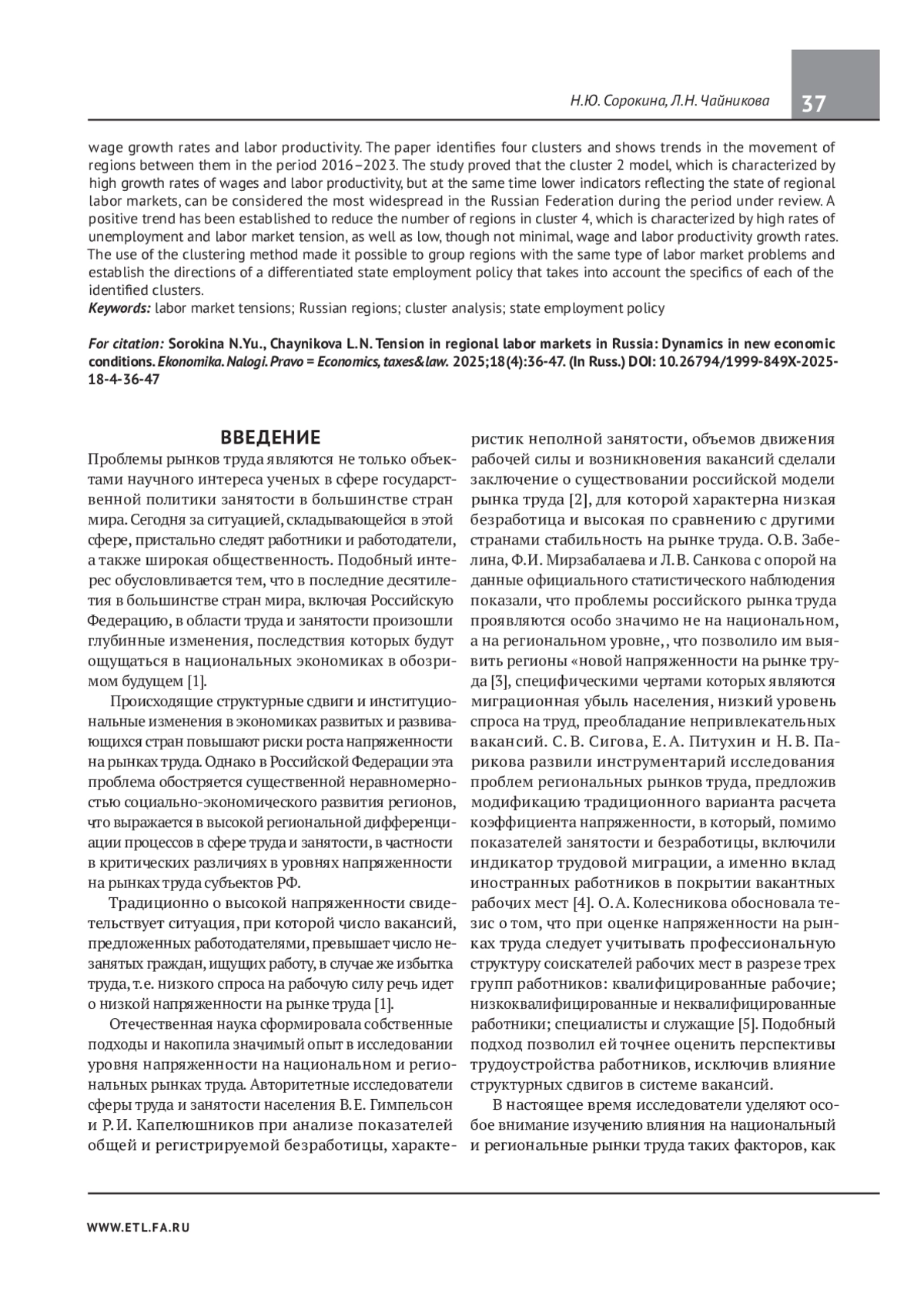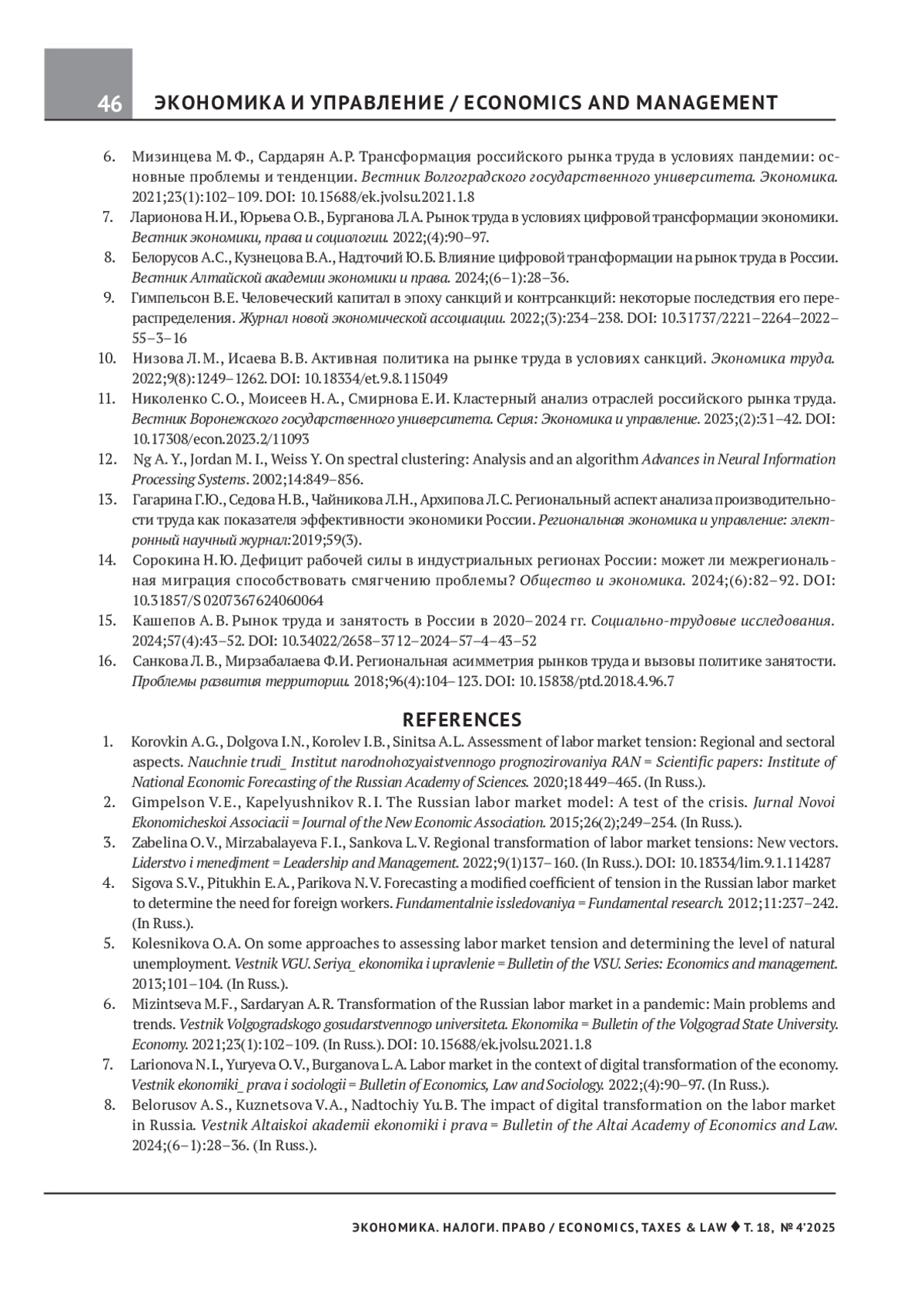 3. Забелина О.В., Мирзабалаева Ф.И., Санкова Л.В. Региональная трансформация напряженности на рынке труда: новые векторы. Лидерство и менеджмент. 2022;9(1):137-160. DOI: 10.18334/lim.9.1.114287 EDN: FREKBT