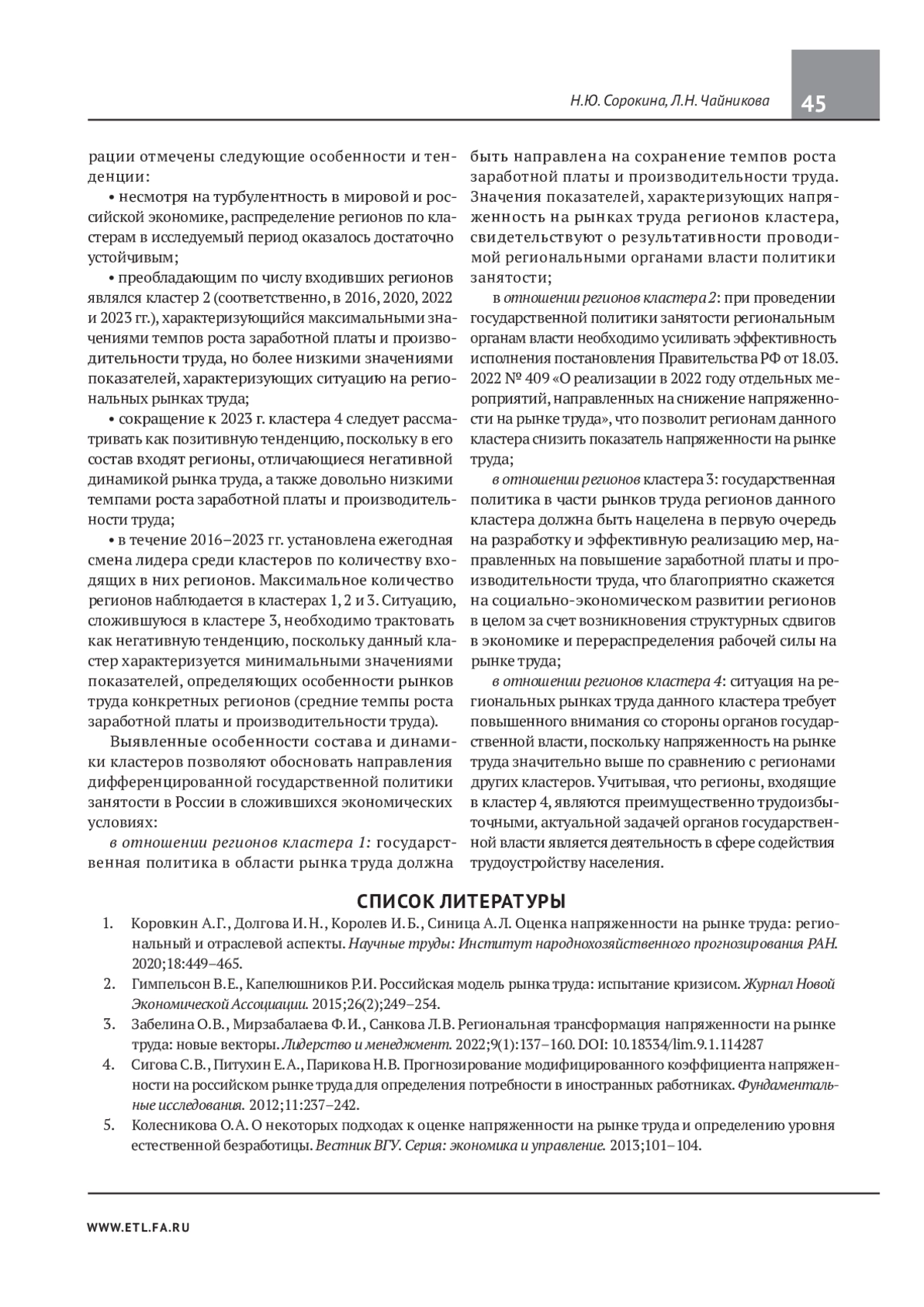 1. Коровкин А.Г., Долгова И.Н., Королев И.Б., Синица А.Л. Оценка напряженности на рынке труда: региональный и отраслевой аспекты. Научные труды: Институт народнохозяйственного прогнозирования РАН. 2020;18:449-465. EDN: TQCTTA