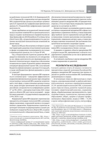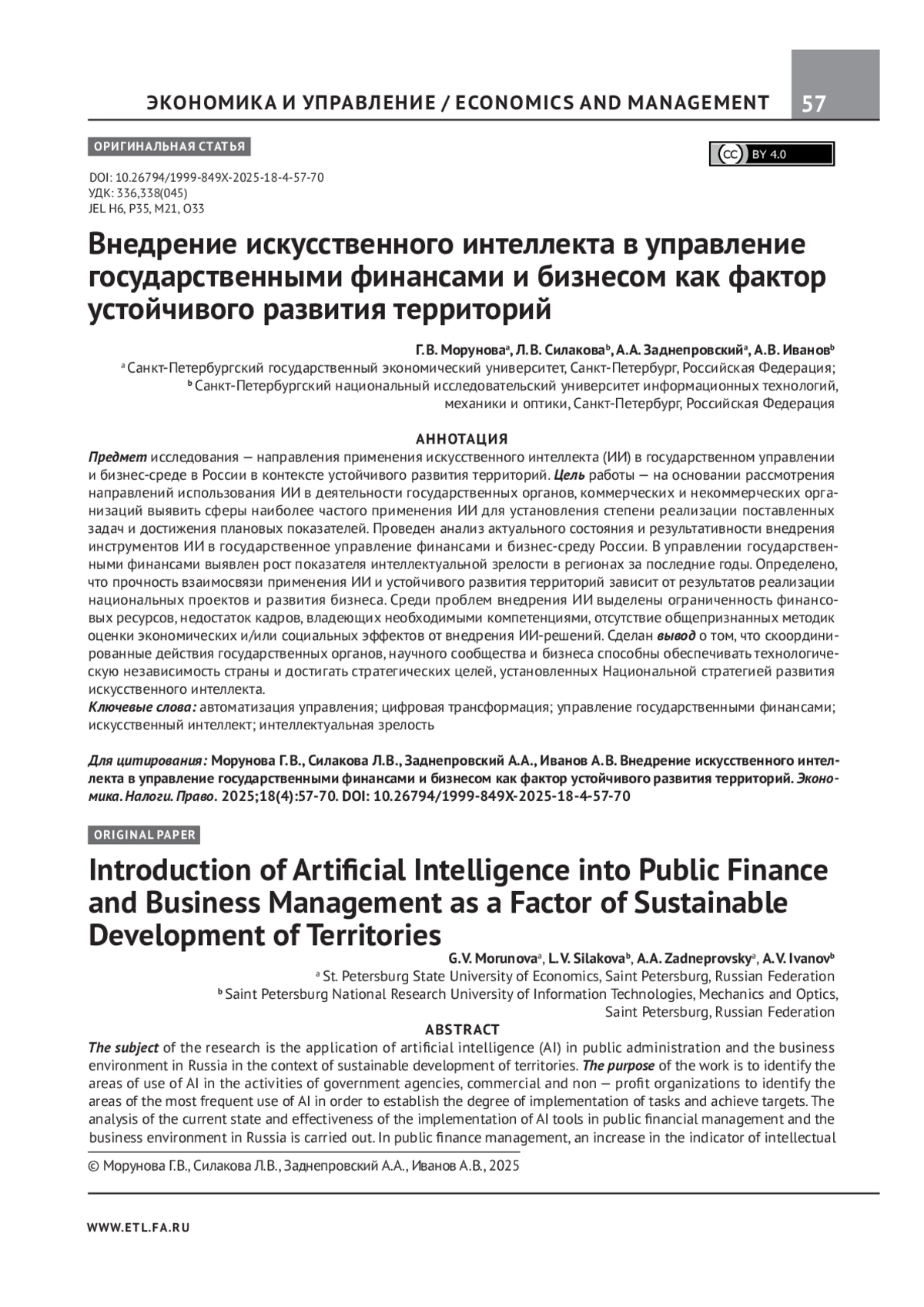 В современном экономическом пространстве происходит стремительное развитие технологий искусственного интеллекта (далее — ИИ), которые широко применяются в различных отраслях российской экономики. Вот почему проблематика выявления и оценки влияния и эффектов, получаемых от цифровизации разных сфер экономической деятельности, активно анализируются учеными и практиками всего мира. При этом для Российской Федерации вопросы интеграции ИИ в государственное управление, в частности в управление государственными финансами (далее — УГФ) и бизнес-сектор приобретают особую важность. Так, в рамках Национальной стратегии развития искусственного интеллекта на период до 2030 г., утвержденной Указом Президента Российской Федерации от 10.10.2019 No 490 (далее — Указ No 490), и федерального проекта «Искусственный интеллект» 1 (далее — федеральный проект ИИ) уделяется приоритетное внимание применению передовых цифровых решений в бюджетном процессе и смежных областях государственного регулирования, а также в деятельности бизнесструктур