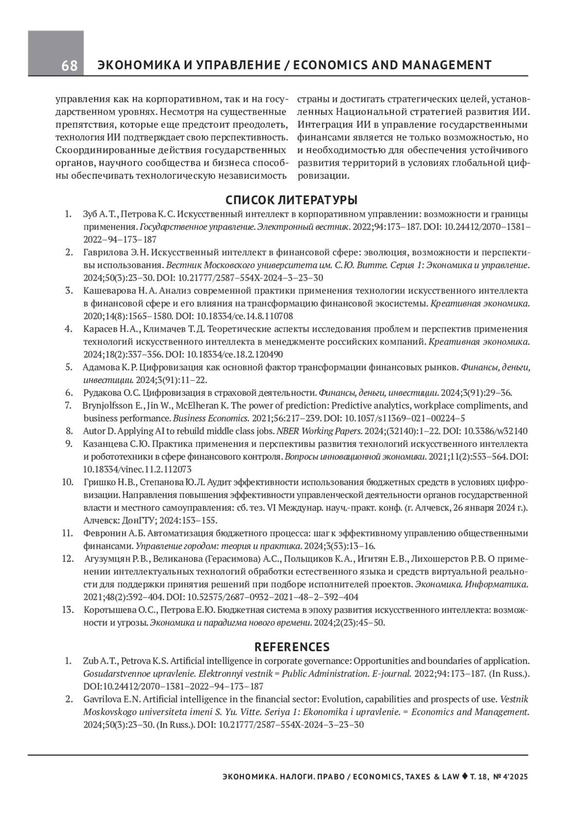 1. Зуб А.Т., Петрова К.С. Искусственный интеллект в корпоративном управлении: возможности и границы применения. Государственное управление. Электронный вестник. 2022;94:173-187. 10.24412/2070-1381- 2022-94-173-187. DOI: 10.24412/2070-1381-2022-94-173-187 EDN: FLGKRR