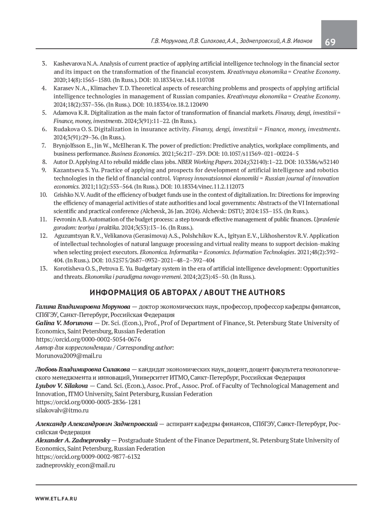 2. Гаврилова Э.Н. Искусственный интеллект в финансовой сфере: эволюция, возможности и перспективы использования. Вестник Московского университета им. С.Ю. Витте. Серия 1: Экономика и управление. 2024;50(3):23-30. 10.21777/2587-554X 2024-3-23-30. DOI: 10.21777/2587-554X2024-3-23-30 EDN: MKGSLD