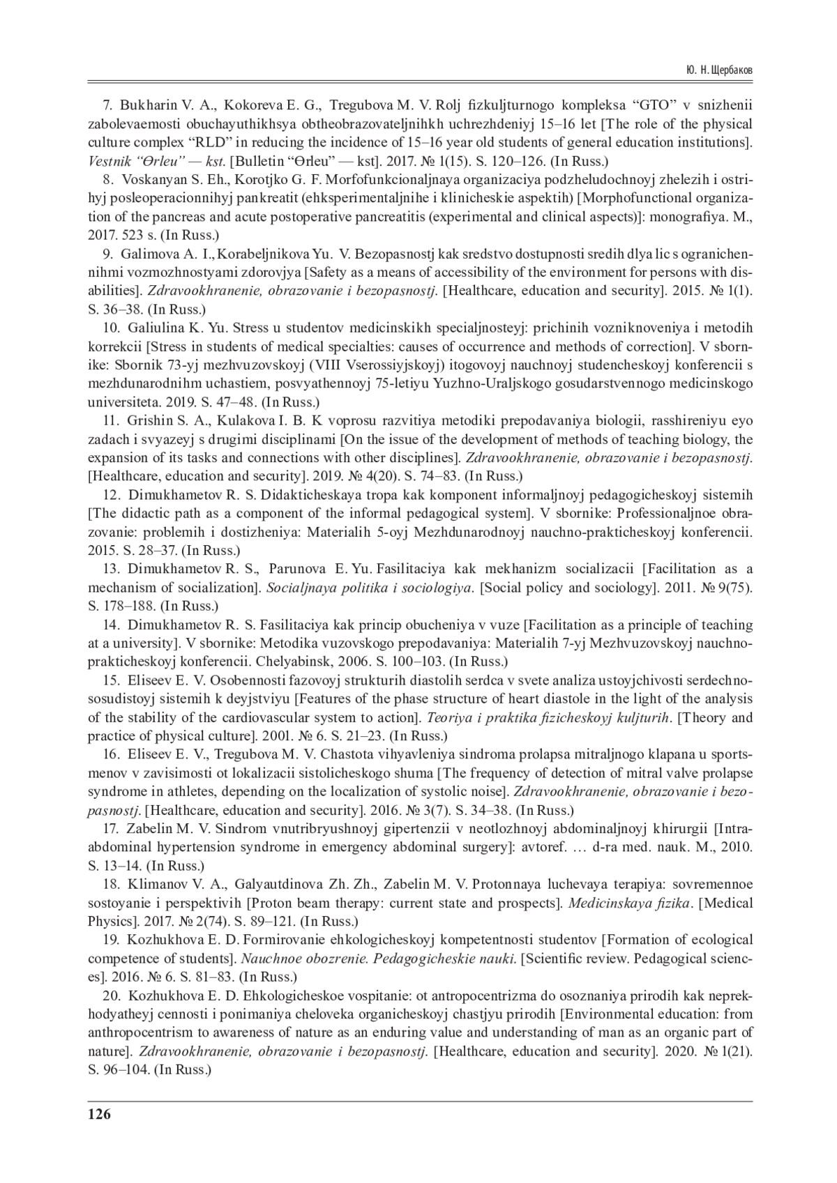 6. Бухарин, В. А. Дифференцированный подход к медико-биологическому и психолого-педагогическому обеспечению физического воспитания современных школьников / В. А. Бухарин // В сборнике: Физическая культура и спорт: проблемы и перспективы научного и инновационно-технического сотрудничества: Материалы VII заседания международного экспертного Совета по вопросам развития экономики и торговли “ЭКСПО-2018”. - 2018. - С. 54-60.